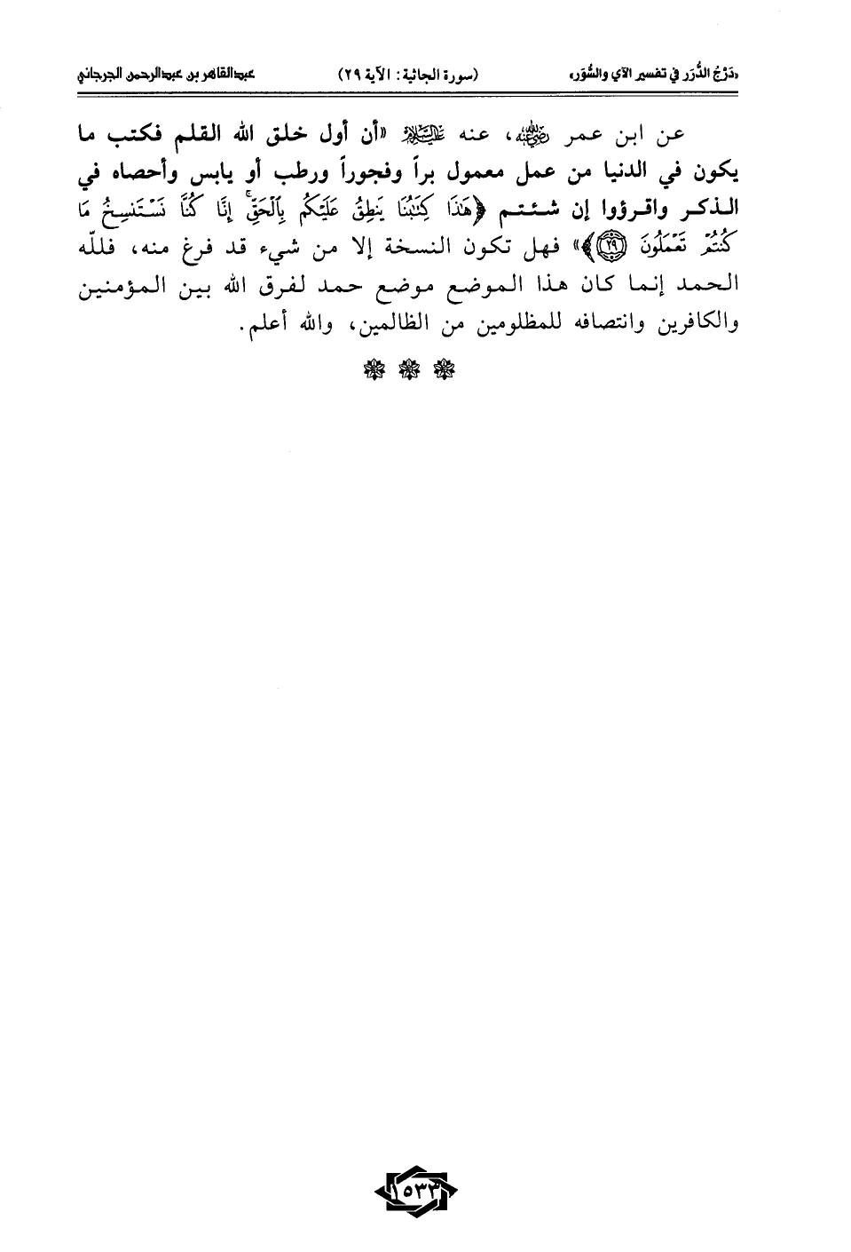 عن ابن عمر - رضي الله عنه -، عنه -عليه السلام- "أن أول خلق الله القلم فكتب ما يكون في الدنيا من عمل معمول برًا وفجورًا ورطب أو يابس وأحصاه في الذكر واقرؤوا إن شئتم {هَذَا كِتَابُنَا يَنْطِقُ عَلَيْكُمْ بِالْحَقِّ إِنَّا كُنَّا نَسْتَنْسِخُ مَا كُنْتُمْ تَعْمَلُونَ (29)} فهل تكون النسخة إلا من شيء قد فرغ منه، فلله الحمد إنما كان هذا الموضع موضع حمد لفرق الله بين المؤمنين والكافرين وانتصافه للمظلومين من الظالمين، والله أعلم.