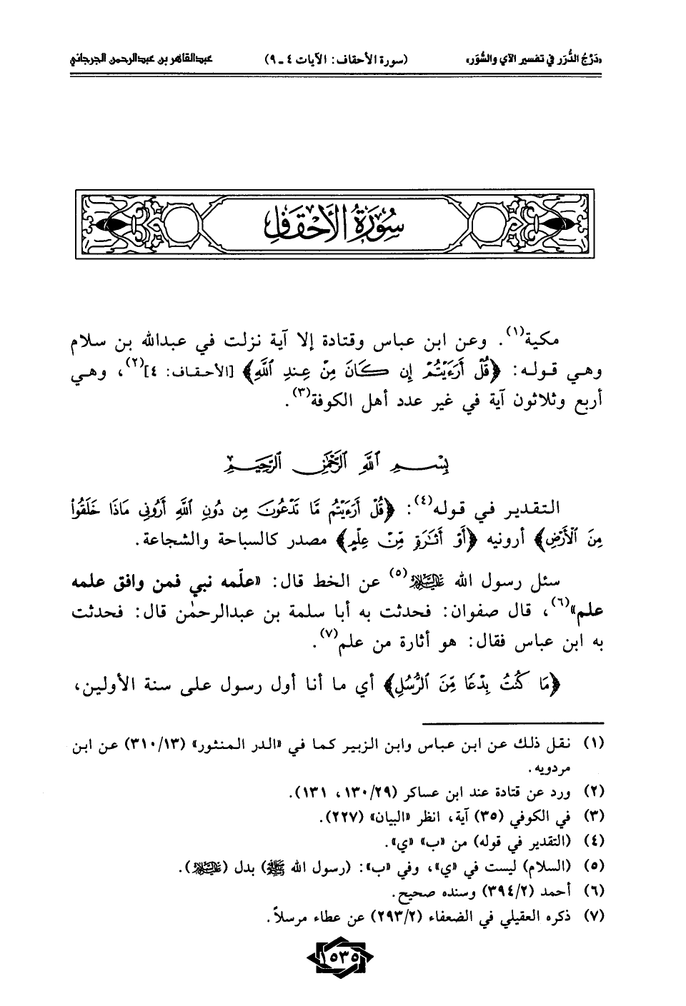 مكية (¬1). وعن ابن عباس وقتادة إلا آية نزلت في عبد الله بن سلام وهي قوله: {قُلْ أَرَأَيْتُمْ إِنْ كَانَ مِنْ عِنْدِ اللَّهِ} [الأحقاف: 4] (¬2)، وهي أربع وئلاثون آية في غير عدد أهل الكوفة (¬3).