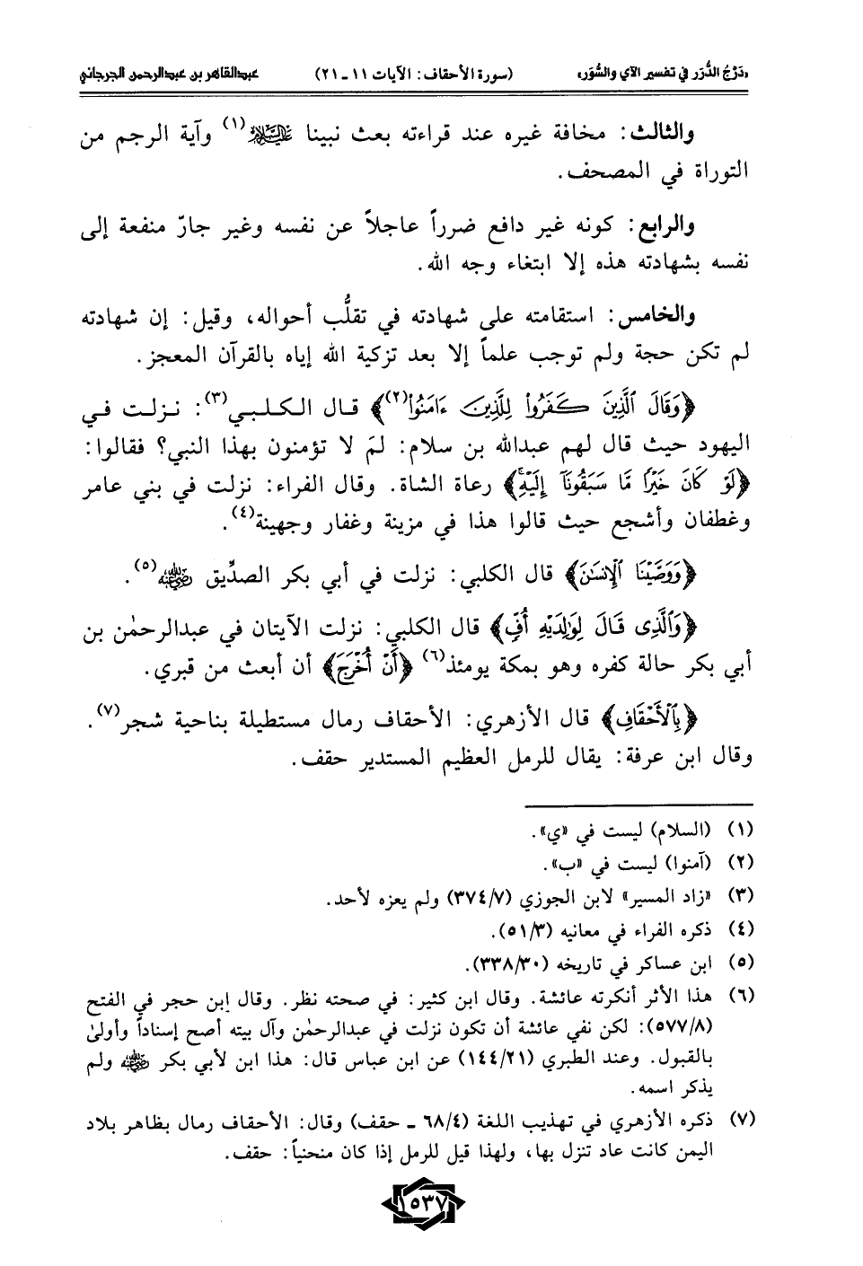 (¬6) هذا الأثر أنكرته عائشة. وقال ابن كثير: في صحته نظر. وقال ابن حجر في الفتح (8/ 577): لكن نفي عائشة أن تكون نزلت في عبد الرحمن وآل بيته أصح إسنادًا وأولى بالقبول. وعند الطبري (21/ 144) عن ابن عباس قال: هذا ابن لأبي بكر - رضي الله عنه - ولم يذكر اسمه.