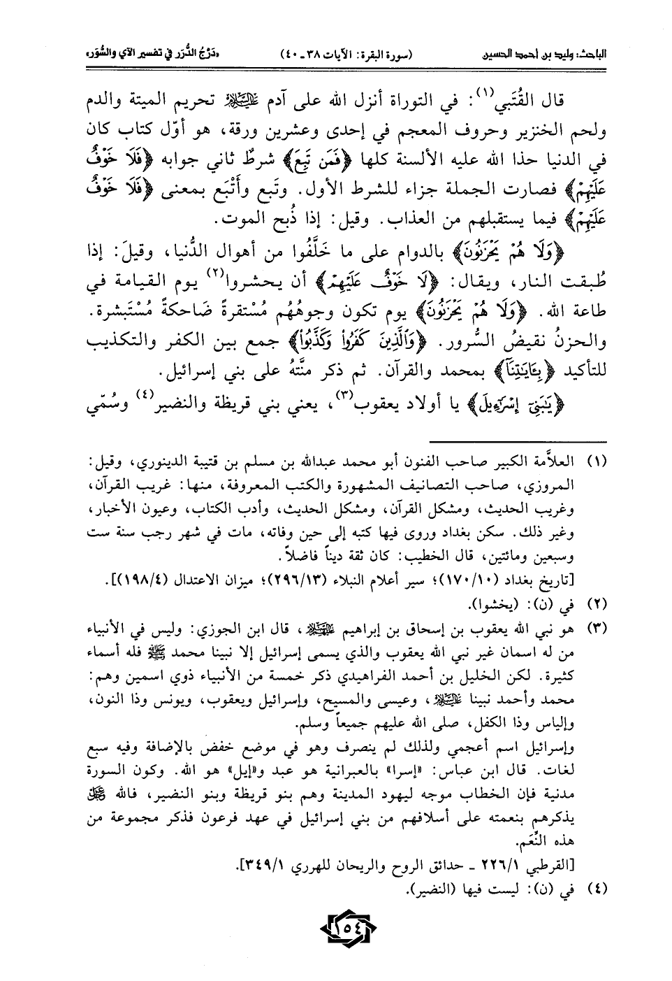 قال القُتَبي (¬1): في التوراة أنزل الله على آدم عليه السلام تحريم الميتة والدم ولحم الخنزير وحروف المعجم في إحدى وعشرين ورقة، هو أوّل كتاب كان في الدنيا حذا الله عليه الألسنة كلها {فَمَنْ تَبِعَ} شرطٌ ثاني جوابه {فَلَا خَوْفٌ عَلَيْهِم} فصارت الجملة جزاء للشرط الأول. وتَبع وأَتْبَع بمعنى {فَلَا خَوْفٌ عَلَيْهِمْ} فيما يستقبلهم من العذاب. وقيل: إذا ذُبح الموت.
