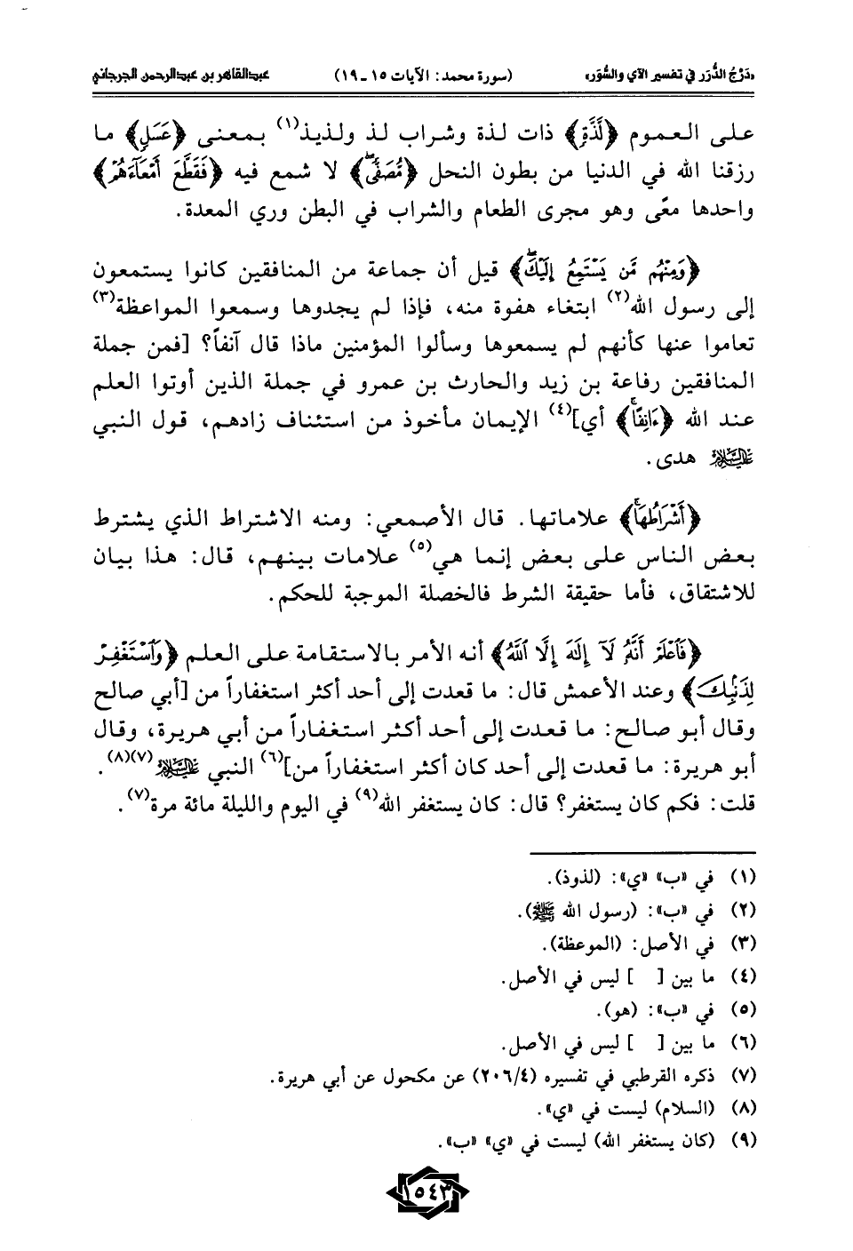 {فَاعْلَمْ أَنَّهُ لَا إِلَهَ إِلَّا اللَّهُ} أنه الأمر بالاستقامة على العلم {وَاسْتَغْفِرْ لِذَنْبِكَ} وعند الأعمش قال: ما قعدت إلى أحد أكثر استغفارًا من [أبي صالح وقال أبو صالح: ما قعدت إلى أحد أكثر استغفارًا من أبي هريرة، وقال أبو هريرة: ما قعدت إلى أحد كان أكثر استغفارًا من] (¬6) النبي -عليه السلام- (¬7) (¬8). قلت: فكم كان يستغفر؟ قال: كان يستغفر الله (¬9) في اليوم والليلة مائة مرة (7).