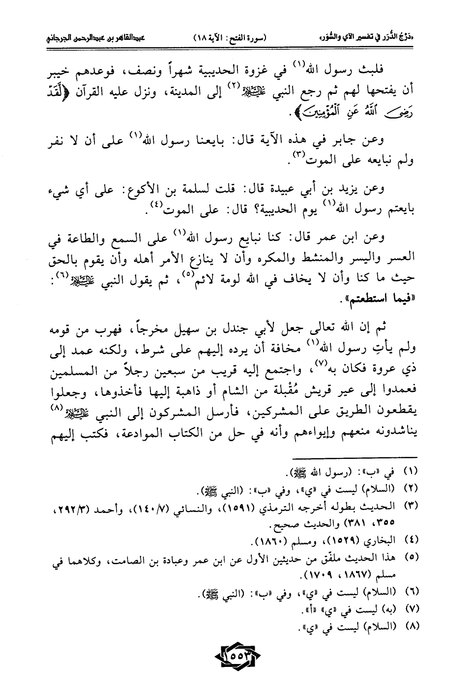 وعن جابر في هذه الآية قال: بايعنا رسول الله (1) على أن لا نفر ولم نبايعه على الموت (¬3).