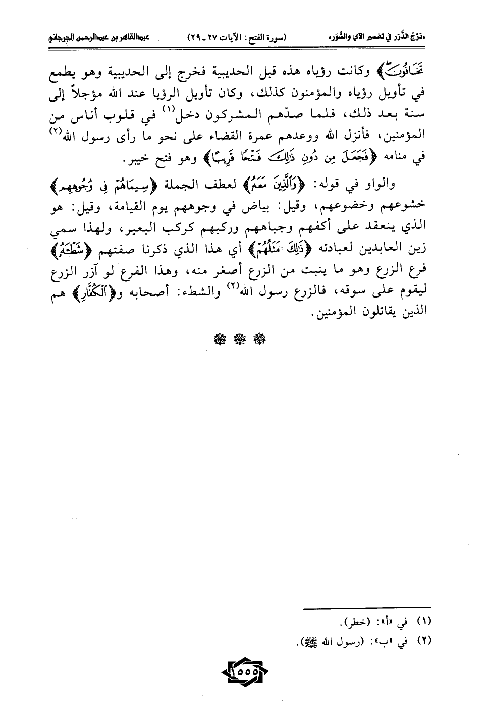 والواو في قوله {وَالَّذِينَ مَعَهُ} لعطف الجملة {سِيمَاهُمْ فِي وُجُوهِهِمْ} خشوعهم وخضوعهم، وقيل: بياض في وجوههم يوم القيامة، وقيل: هو الذي ينعقد على أكفهم وجباههم وركبهم كركب البعير، ولهذا سمي زين العابدين لعبادته {ذَلِكَ مَثَلُهُمْ} أي هذا الذي ذكرنا صفتهم {شَطْأَهُ} فرع الزرع وهو ما ينبت من الزرع أصغر منه، وهذا الفرع لو آزر الزرع ليقوم على سوقه، فالزرع رسول الله (2) والشطء: أصحابه و {الْكُفَّارَ} هم الذين يقاتلون المؤمنين.