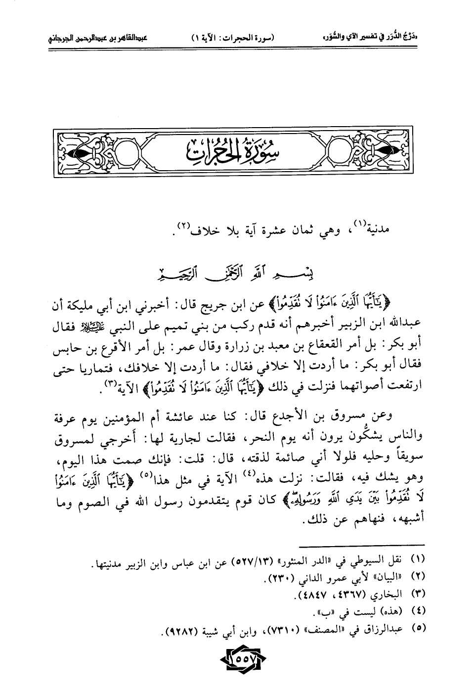 {يَا أَيُّهَا الَّذِينَ آمَنُوا} عن ابن جريج قال: أخبرني ابن أبي مليكة أن عبد الله ابن الزبير أخبرهم أنه قدم ركب من بني تميم على النبي -عليه السلام- فقال أبو بكر: بل أمر القعقاع بن معبد بن زرارة وقال عمر: بل أمر الأقرع بن حابس فقال أبو بكر: ما أردت إلا خلافي فقال: ما أردت إلا خلافك، فتماريا حتى ارتفعت أصواتهما فنزلت في ذلك {يَا أَيُّهَا الَّذِينَ آمَنُوا لَا تُقَدِّمُوا} الآية (¬3).