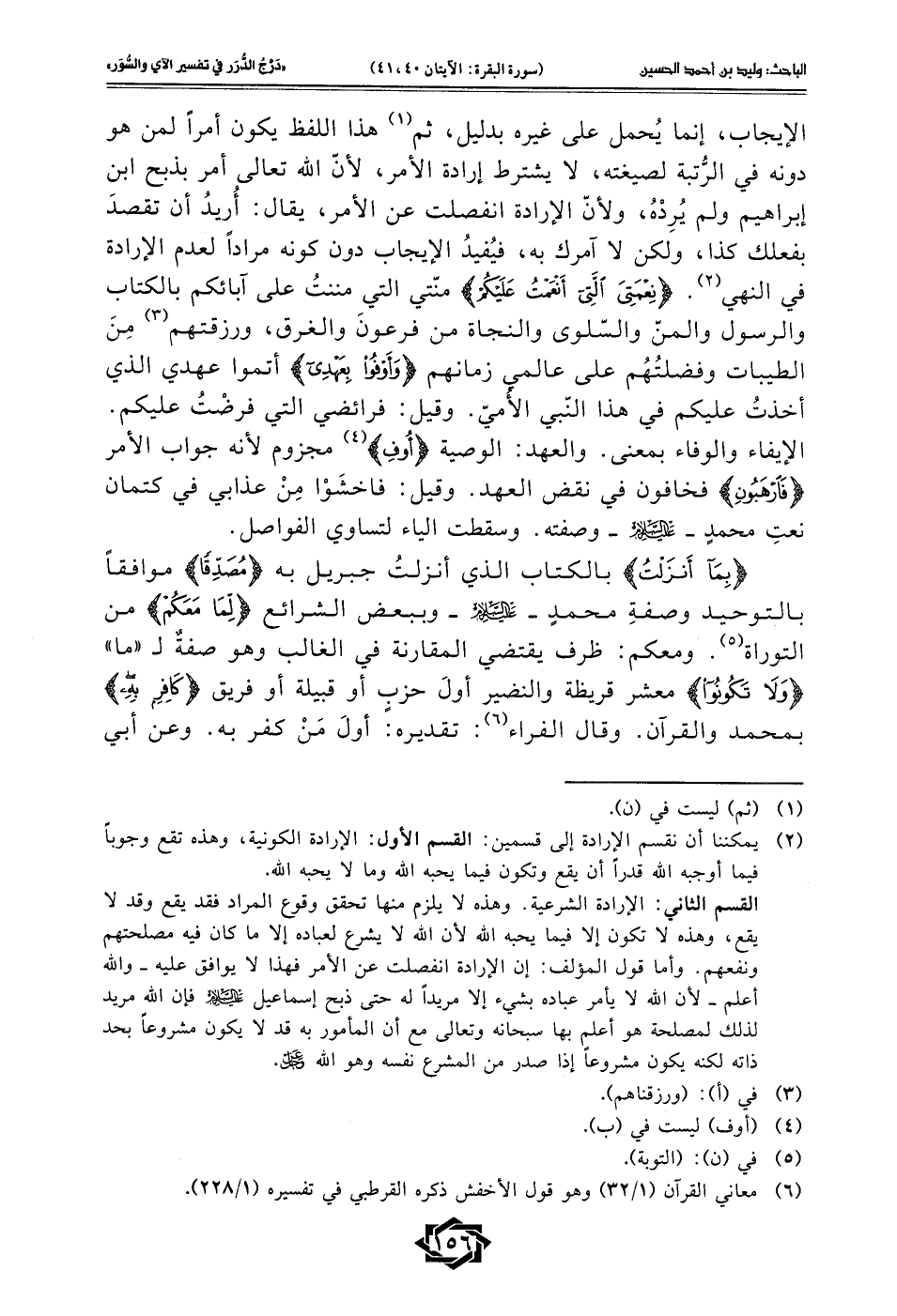 الإيجاب، إنما يُحمل على غيره بدليل، ثم (¬1) هذا اللفظ يكون أمرًا لمن هو دونه في الرُّتبة لصيغته، لا يشترط إرادة الأمر, لأنّ الله تعالى أمر بذبح ابن إبراهيم ولم يُرِدْهُ، ولأنّ الإرادة انفصلت عن الأمر، يقال: أُريدُ أن تقصدَ بفعلك كذا, ولكن لا آمرك به، فيُفيدُ الإيجاب دون كونه مرادًا لعدم الإرادة في النهي (¬2). {نِعْمَتِيَ الَّتِي أَنْعَمْتُ عَلَيْكُمْ} منّتي التي مننتُ على آبائكم بالكتاب والرسول والمنّ والسّلوى والنجاة من فرعونَ والغرق، ورزقتهم (¬3) مِنَ الطيبات وفضلتُهُم على عالمي زمانهم {وَأَوْفُوا بِعَهْدِي} أتموا عهدي الذي أخذتُ عليكم في هذا النبي الأُميّ. وقيل: قرائضي التي فرضْتُ عليكم. الإيفاء والوفاء بمعنى. والعهد: الوصية {أَوْفِ} (¬4) مجزوم لأنه جواب الأمر {فَارْهَبُونِ} فخافون في نقض العهد. وقيل: فاخشَوْا مِنْ عذابي في كتمان نعتِ محمَّدٍ - عليه السلام - وصفته. وسقطت الياء لتساوي الفواصل.