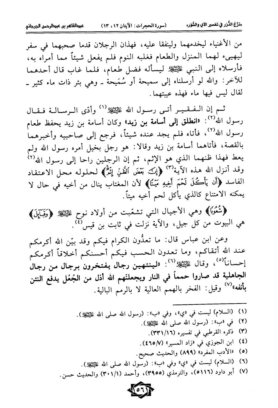 وعن ابن عباس قال: ما تعدُّون الكرام فيكم وقد بيّن الله أكرمكم عند الله أتقاكم، وما تعدون الحسب فيكم أحسنكم أخلاقًا أكرمكم إحسانًا (¬5)، وقال -عليه السلام- (¬6): "لينتهين رجال يفتخرون برجال من رجال الجاهلية قد صاروا حممًا في النار ويجعلنَّهم الله أذل من الجُعُل يدفع النتن بأنفه" (¬7) وقيل: الفخر بالهمم العالية لا بالرمم البالية.