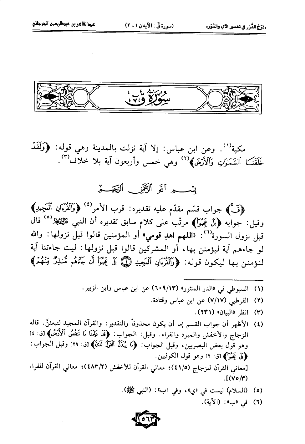 (¬4) الأظهر أن جواب القسم إما أن يكون محذوفًا والتقدير: والقرآن المجيد لتبعثنَّ. قاله الزجاج والأخفش والمبرد والفراء. وقيل: الجواب: {قَدْ عَلِمْنَا مَا تَنْقُصُ الْأَرْضُ} [ق: 4]، وهو قول بعض البصريين، وقيل الجواب: {مَا يُبَدَّلُ الْقَوْلُ لَدَيَّ} [ق: 29] وقيل الجواب: {بَلْ عَجِبُوا} [ق: 2] وهو قول الكوفيين.