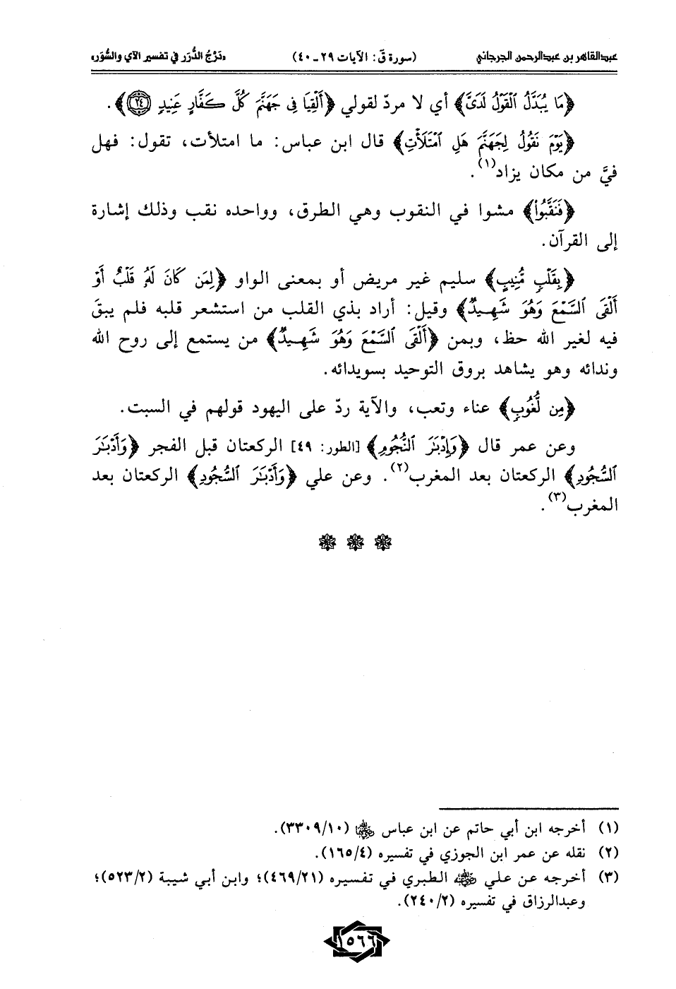 وعن عمر قال {وَإِدْبَارَ النُّجُومِ} [الطور: 49] الركعتان قبل الفجر {وَأَدْبَارَ السُّجُودِ} الركعتان بعد المغرب (¬2). وعن علي {وَأَدْبَارَ السُّجُودِ} الركعتان بعد المغرب (¬3).
