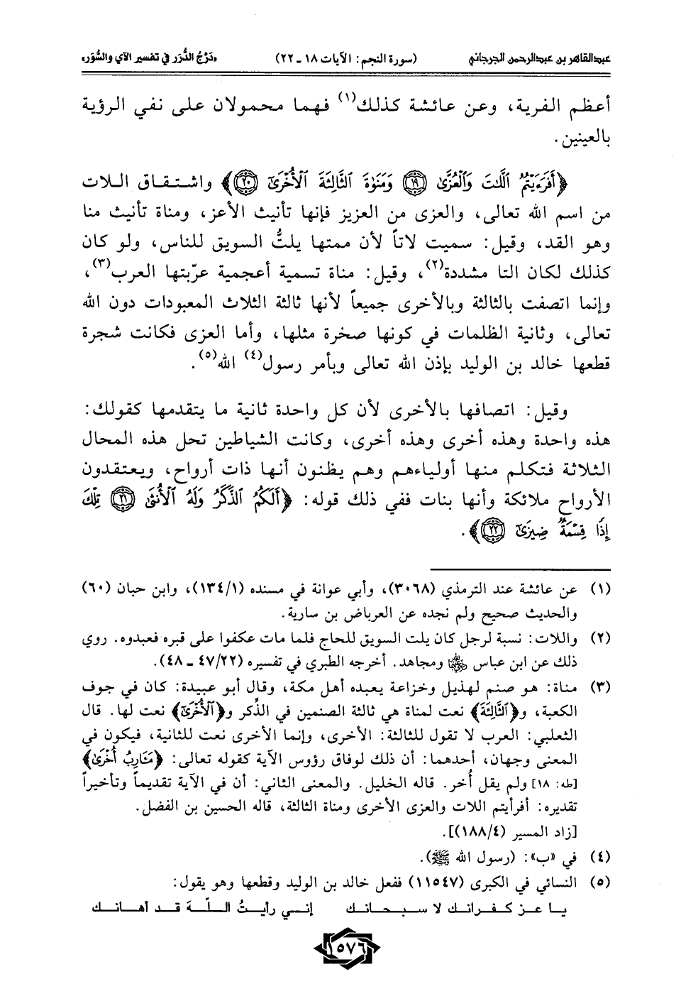 {أَفَرَأَيْتُمُ اللَّاتَ وَالْعُزَّى (19) وَمَنَاةَ الثَّالِثَةَ الْأُخْرَى (20)} واشتقاق اللات من اسم الله تعالى، والعزى من العزيز فإنها تأنيث الأعز، ومناة تأنيث منا وهو القد، وقيل: سميت لاتًا لأن ممتها يلتُّ السويق للناس، ولو كان كذلك لكان التا مشددة (¬2)، وقيل: مناة تسمية أعجمية عرّبتها العرب (¬3)، وإنما اتصفت بالثالثة وبالأخرى جميعًا لأنها ثالثة الثلاث المعبودات دون الله تعالى، وثانية الظلمات في كونها صخرة مثلها، وأما العزى فكانت شجرة قطعها خالد بن الوليد بإذن الله تعالى وبأمر رسول (¬4) الله (¬5).