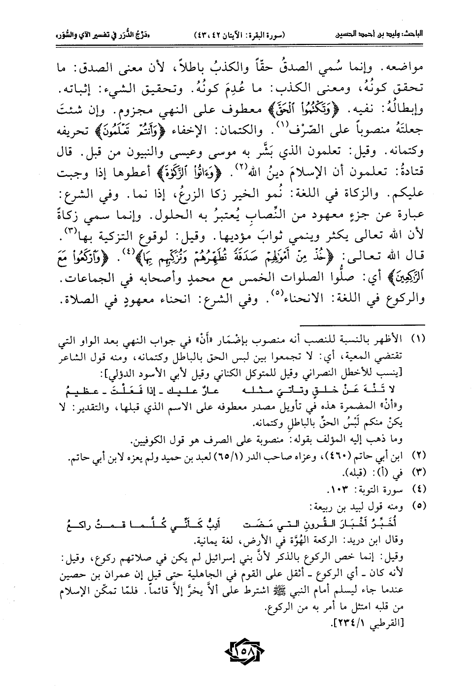 مواضعه. وإنما سُمي الصدقُ حقًّا والكذبُ باطلًا؛ لأن معنى الصدق: ما تحقق كونُهُ، ومعنى الكذب: ما عُدِمَ كونُهُ. وتحقيق الشيء: إثباته. وإبطالُهُ: نفيه. {وَتَكْتُمُوا الْحَقَّ} معطوف على النهي مجزوم. وإن شئتَ جعلتَهُ منصوبًا على الصّرْف (¬1). والكتمان: الإخفاء {وَأَنْتُمْ تَعْلَمُونَ} تحريفه وكتمانه. وقيل: تعلمون الذي بَشَّر به موسى وعيسى والنبيون من قبل. قال قتادةُ: تعلمون أن الإِسلامَ دينُ الله (¬2). {وَآتُوا الزَّكَاةَ} أعطوها إذا وجبت عليكم. والزكاة في اللغة: نُمو الخير زكا الزرعُ، إذا نما. وفي الشرع: عبارة عن جزءٍ معهود من النِّصابِ يُعتبرُ به الحلول. وإنما سمي زكاةً لأن الله تعالى يكثر وينمي ثوابَ مؤديها. وقيل: لوقوع التزكية بها (¬3). قال الله تعالى: {خُذْ مِنْ أَمْوَالِهِمْ صَدَقَةً تُطَهِّرُهُمْ وَتُزَكِّيهِمْ بِهَا} (¬4). {وَارْكَعُوا مَعَ الرَّاكِعِينَ} أي: صلُّوا الصلوات الخمس مع محمَّدٍ وأصحابه في الجماعات. والركوع في اللغة: الانحناء (¬5). وفي الشرع: انحناء معهودٍ في الصلاة.