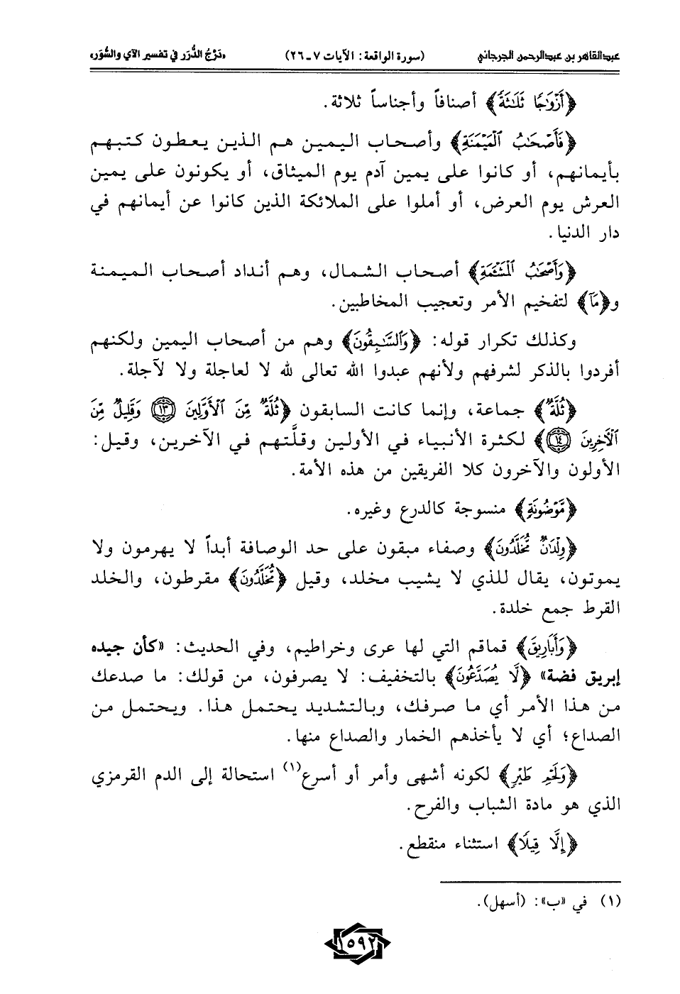 {ثُلَّةٌ} جماعة، وإنما كانت السابقون {ثُلَّةٌ مِنَ الْأَوَّلِينَ (13) وَقَلِيلٌ مِنَ الْآخِرِينَ (14)} لكثرة الأنبياء في الأولين وقلَّتهم في الآخرين، وقيل: الأولون والآخرون كلا الفريقين من هذه الأمة.