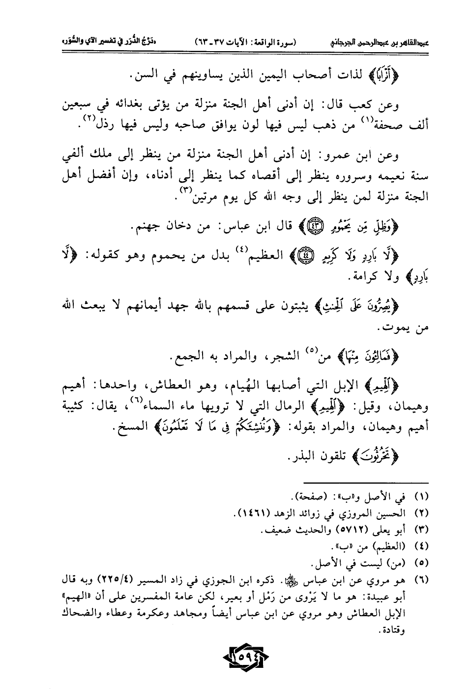 (¬6) هو مروي عن ابن عباس - رضي الله عنهما -. ذكره ابن الجوزي في زاد المسير (4/ 225) وبه قال أبو عبيدة: هو ما لا يَرْوى من رَمْل أو بعير، لكن عامة المفسرين على أن "الهيم" الإبل العطاش وهو مروي عن ابن عباس أيضًا ومجاهد وعكرمة وعطاء والضحاك وقتادة.