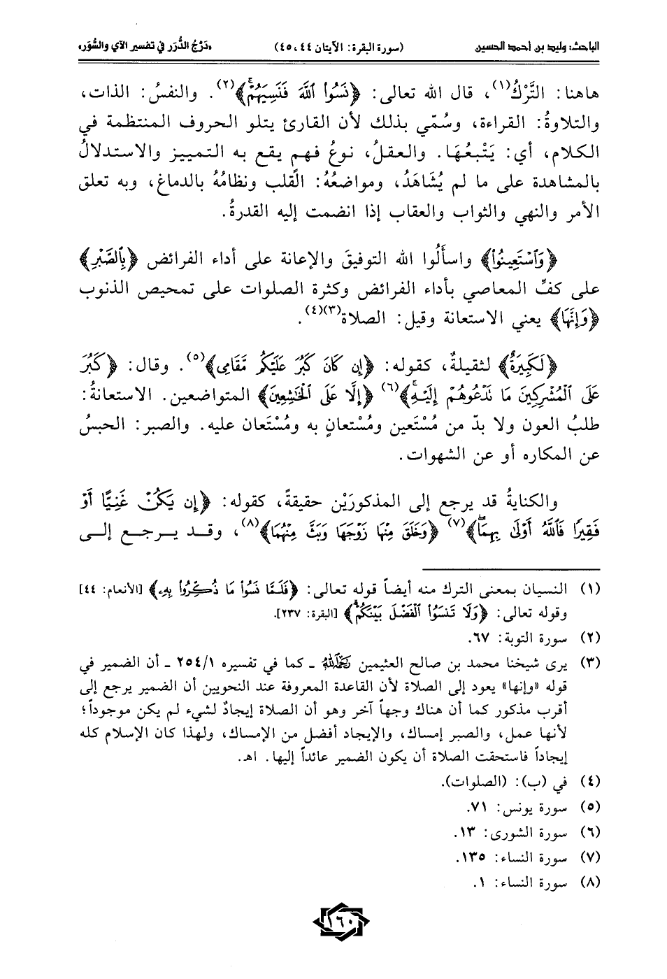 (¬3) يرى شيخنا محمَّد بن صالح العثيمين - رحمه الله - كما في تفسيره 1/ 254 - أن الضمير في قوله "وإنها" يعود إلى الصلاة لأن القاعدة المعروفة عند النحويين أن الضمير يرجع إلى أقرب مذكور كما أن هناك وجهًا آخر وهو أن الصلاة إيجادٌ لشيء لم يكن موجودًا؛ لأنها عمل، والصبر إمساك، والإيجاد أفضل من الإمساك، ولهذا كان الإِسلام كله إيجادًا فاستحقت الصلاة أن يكون الضمير عائدًا إليها. اهـ.