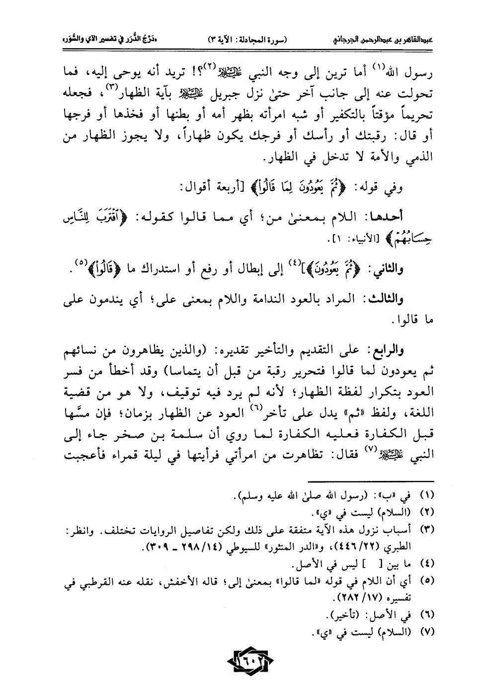 والرابع: على التقديم والتأخير تقديره: (والذين يظاهرون من نسائهم ثم يعودون لما قالوا فتحرير رقبة من قبل أن يتماسا) وقد أخطأ من فسر العود بتكرار لفظة الظهار؛ لأنه لم يرد فيه توقيف، ولا هو من قضية اللغة، ولفظ "ثم" يدل على تأخر (¬6) العود عن الظهار بزمان؛ فإن مسَّها قبل الكفارة فعليه الكفارة لما روي أن سلمة بن صخر جاء إلى النبي -عليه السلام- (¬7) فقال: تظاهرت من امرأتي فرأيتها في ليلة قمراء فأعجبت