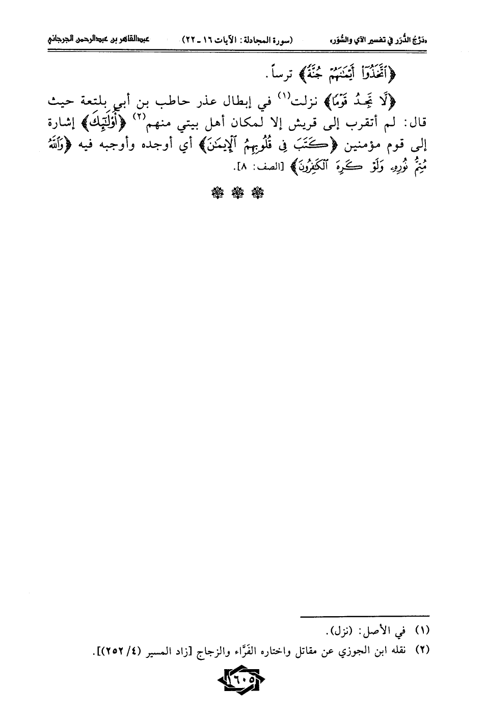 {لَا تَجِدُ قَوْمًا} نزلت (¬1) في إبطال عذر حاطب بن أبي بلتعة حيث قال: لم أتقرب إلى قريش إلا لمكان أهل بيتي منهم (¬2) {أُولَئِكَ} إشارة إلى قوم مؤمنين {كَتَبَ فِي قُلُوبِهِمُ الْإِيمَانَ} أىِ أوجده وأوجبه فيه {وَاللَّهُ مُتِمُّ نُورِهِ وَلَوْ كَرِهَ الْكَافِرُونَ} [الصف: 8].