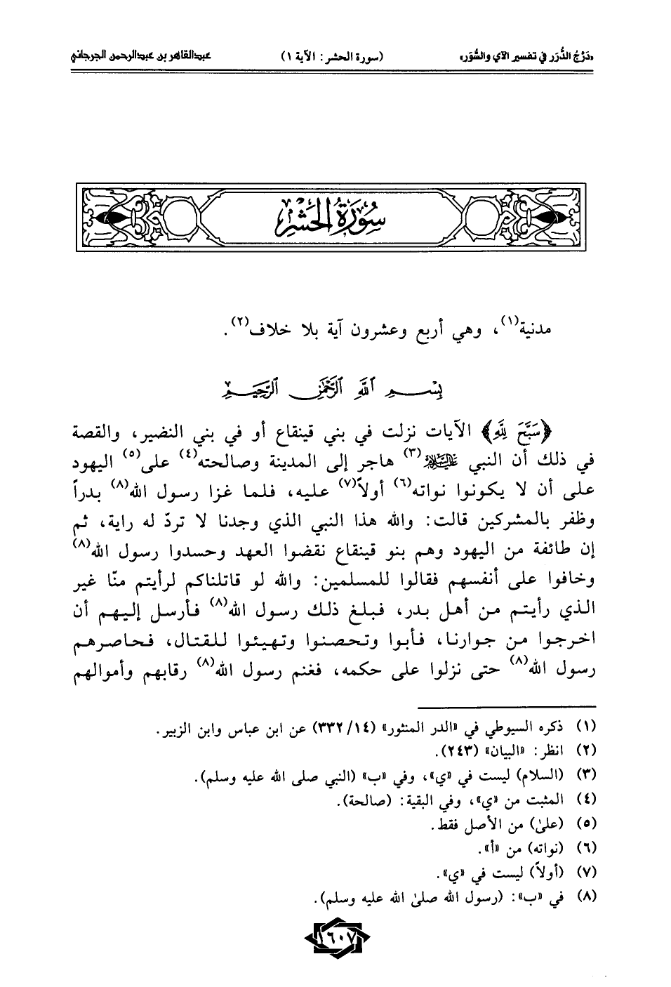 {سَبَّحَ لِلَّهِ} الآيات نزلت في بني قينقاع أو في بني النضير، والقصة في ذلك أن النبي -عليه السلام- (¬3) هاجر إلى المدينة وصالحته (¬4) على (¬5) اليهود على أن لا يكونوا نواته (¬6) أولًا (¬7) عليه، فلما غزا رسول الله (¬8) بدرًا وظفر بالمشركين قالت: والله هذا النبي الذي وجدنا لا تردّ له راية، ثم إن طائفة من اليهود وهم بنو قينقاع نقضوا العهد وحسدوا رسول الله (8) وخافوا على أنفسهم فقالوا للمسلمين: والله لو قاتلناكم لرأيتم منّا غير الذي رأيتم من أهل بدر، فبلغ ذلك رسول الله (8) فأرسل إليهم أن اخرجوا من جوارنا، فأبوا وتحصنوا وتهيئوا للقتال، فحاصرهم رسول الله (8) حتى نزلوا على حكمه، فغنم رسول الله (8) رقابهم وأموالهم