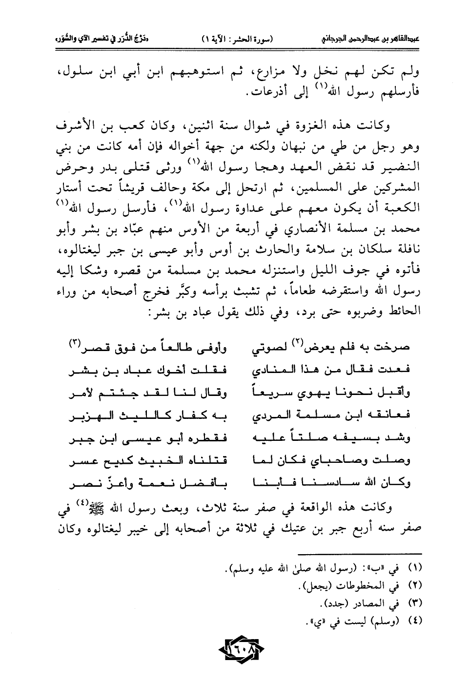 ولم تكن لهم نخل ولا مزارع، ثم استوهبهم ابن أبي ابن سلول، فأرسلهم رسول الله (¬1) إلى أذرعات. وكانت هذه الغزوة في شوال سنة اثنين، وكان كعب بن الأشرف وهو رجل من طي من نبهان ولكنه من جهة أخواله فإن أمه كانت من بني النضير قد نقض العهد وهجا رسول الله (1) ورثى قتلى بدر وحرض المشركين على المسلمين، ثم ارتحل إلى مكة وحالف قريشًا تحت أستار الكعبة أن يكون معهم على عداوة رسول الله (1)، فأرسل رسول الله (1) محمَّد بن مسلمة الأنصاري في أربعة من الأوس منهم عبّاد بن بشر وأبو نافلة سلكان بن سلامة والحارث بن أوس وأبو عيسى بن جبر ليغتالوه، فأتوه في جوف الليل واستنزله محمَّد بن مسلمة من قصره وشكا إليه رسول الله واستقرضه طعامًا، ثم تشبث برأسه وكبَّر فخرج أصحابه من وراء الحائط وضربوه حتى برد، وفي ذلك يقول عباد بن بشر: