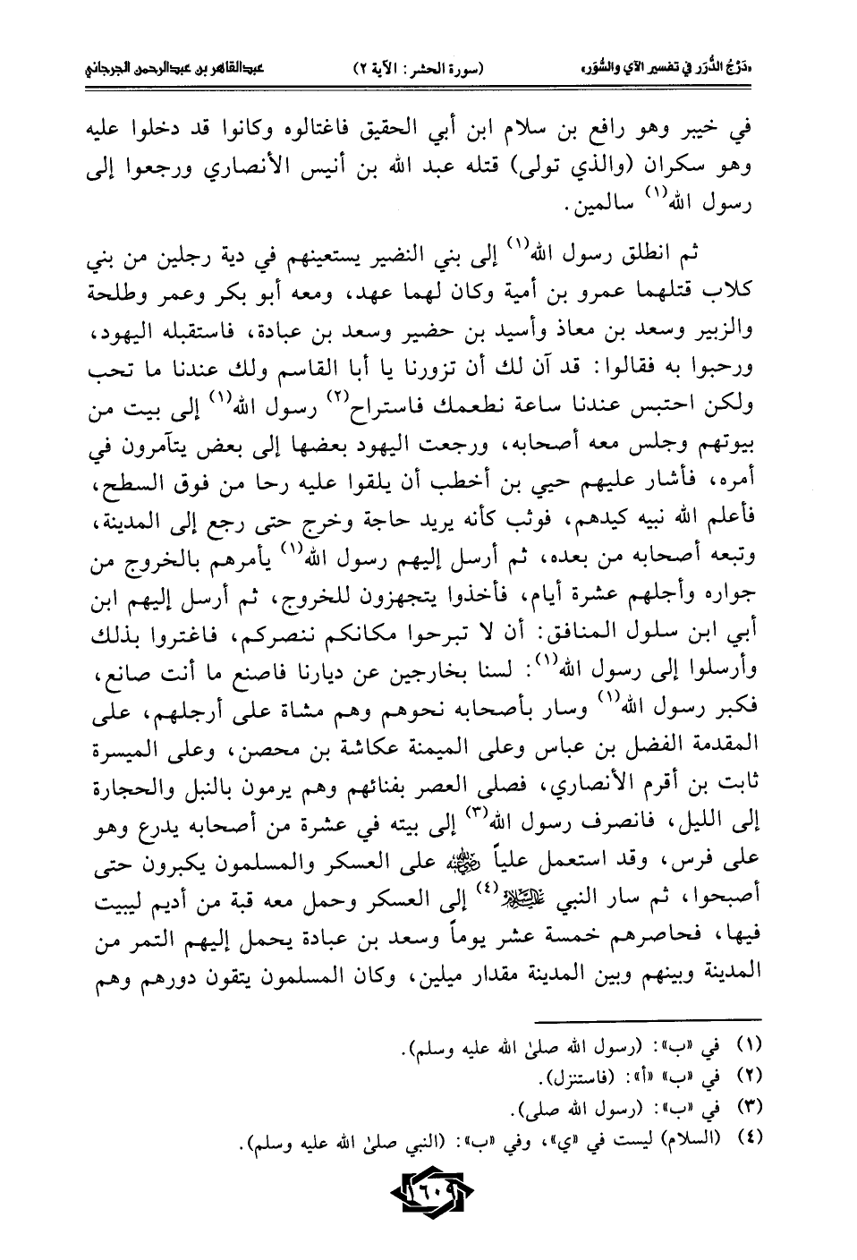 ثم انطلق رسول الله (1) إلى بني النضير يستعينهم في دية رجلين من بني كلاب قتلهما عمرو بن أمية وكان لهما عهد، ومعه أبو بكر وعمر وطلحة والزبير وسعد بن معاذ وأسيد بن حضير وسعد بن عبادة، فاستقبله اليهود، ورحبوا به فقالوا: قد آن لك أن تزورنا يا أبا القاسم ولك عندنا ما تحب ولكن احتبس عندنا ساعة نطعمك فاستراح (¬2) رسول الله (1) إلى بيت من بيوتهم وجلس معه أصحابه، ورجعت اليهود بعضها إلى بعض يتآمرون في أمره، فأشار عليهم حيي بن أخطب أن يلقوا عليه رحا من فوق السطح، فأعلم الله نبيه كيدهم، فوثب كأنه يريد حاجة وخرج حتى رجع إلى المدينة، وتبعه أصحابه من بعده، ثم أرسل إليهم رسول الله (1) يأمرهم بالخروج من جواره وأجلهم عشرة أيام، فأخذوا يتجهزون للخروج، ثم أرسل إليهم ابن أبي ابن سلول المنافق: أن لا تبرحوا مكانكم ننصركم، فاغتروا بذلك وأرسلوا إلى رسول الله (1): لسنا بخارجين عن ديارنا فاصنع ما أنت صانع، فكبر رسول الله (1) وسار بأصحابه نحوهم وهم مشاة على أرجلهم، على المقدمة الفضل بن عباس وعلى الميمنة عكاشة بن محصن، وعلى الميسرة ثابت بن أقرم الأنصاري، فصلى العصر بفنائهم وهم يرمون بالنبل والحجارة إلى الليل، فانصرف رسول الله (¬3) إلى بيته في عشرة من أصحابه يدرع وهو على فرس، وقد استعمل عليًا - رضي الله عنه - على العسكر والمسلمون يكبرون حتى أصبحوا، ثم سار النبي -عليه السلام- (¬4) إلى العسكر وحمل معه قبة من أديم ليبيت فيها، فحاصرهم خمسة عشر يومًا وسعد بن عبادة يحمل إليهم التمر من المدينة وبينهم وبين المدينة مقدار ميلين، وكان المسلمون يتقون دورهم وهم