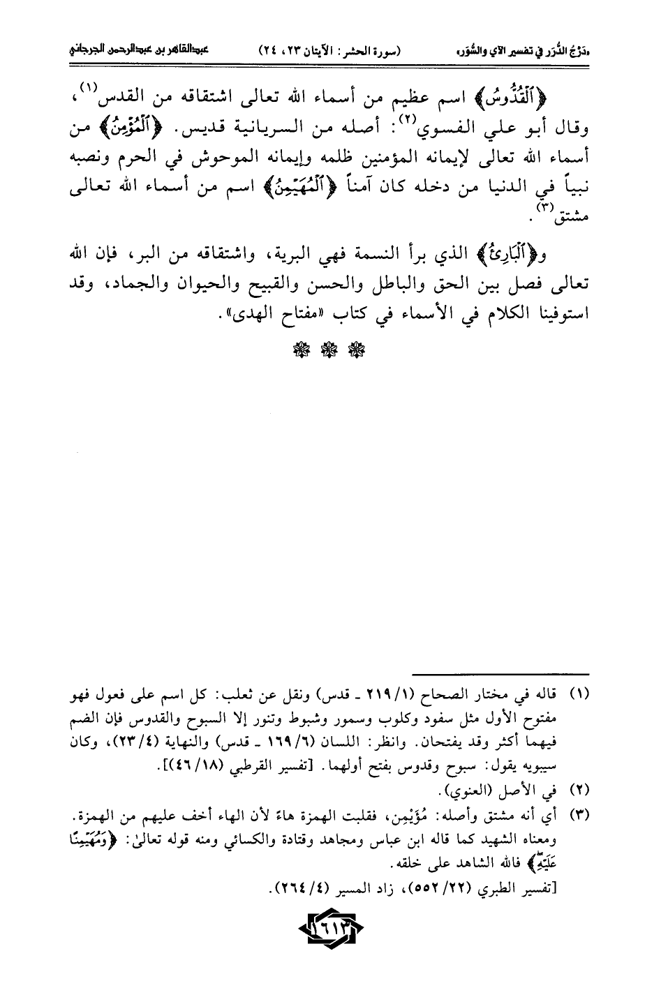 {الْقُدُّوسُ} اسم عظيم من أسماء الله تعالى اشتقاقه من القدس (¬1)، وقال أبو علي الفسوي (¬2): أصله من السريانية قديس. {الْمُؤْمِنُ} من أسماء الله تعالى لإيمانه المؤمنين ظلمه وإيمانه الموحوش في الحرم ونصبه نبيًا في الدنيا من دخله كان آمنًا {الْمُهَيْمِنُ} اسم من أسماء الله تعالى مشتق (¬3).