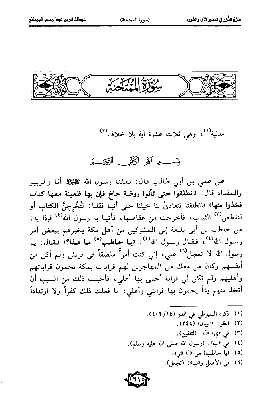 عن علي بن أبي طالب قال: بعثنا رسول الله -عليه السلام- أنا والزبير والمقداد قال: "انطلقوا حتى تأتوا روضة خاخ فإن بها ظعينة معها كتاب فخذوا منها" فانطلقنا تتعادى بنا خيلنا حتى أتينا فقلنا: لتُخْرِجِنَّ الكتاب أو لنقطعن (¬3) الثياب، فأخرجت من عقاصها، فأتينا به رسول الله (¬4) فإذا به: من حاطب بن أبي بلتعة إلى المشركين من أهل مكة يخبرهم ببعض أمر رسول الله (4)، فقال رسول الله (4): "يا حاطب (¬5) ما هذا؟ " فقال: يا رسول الله لا تعجل (¬6) علي، إني كنت أمرأً ملصقًا في قريش ولم أكن من أنفسهم وكان من معك من المهاجرين لهم قرابات بمكة يحمون قراباتهم وأهليهم ولم تكن لي قرابة أحمي بها أهلي، فأحببت ذلك من السبب أن أتخذ منهم يدًا يحمون بها قرابتي وأهلي، ما فعلت ذلك كفرًا ولا ارتدادًا