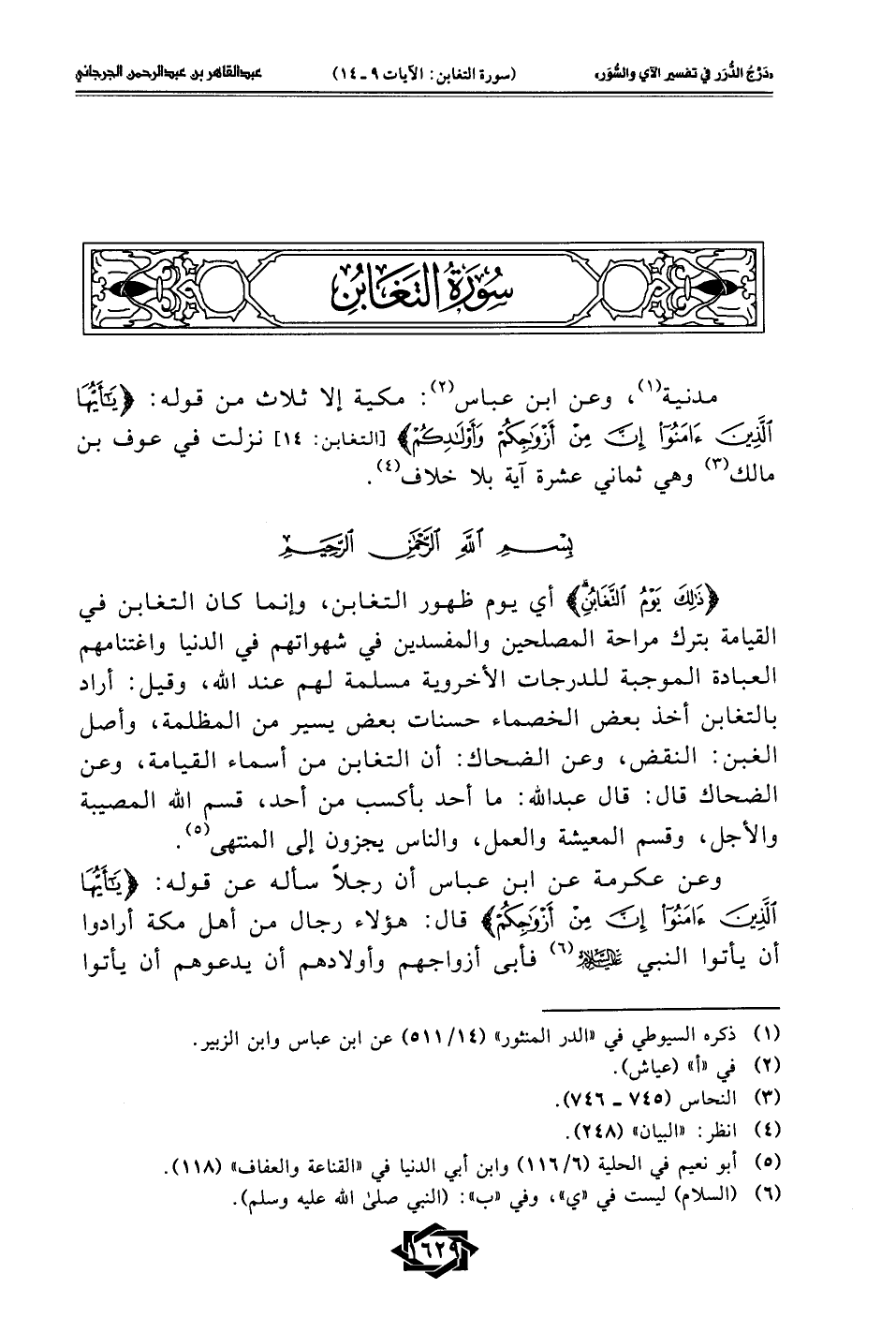 مدنية (¬1)، وعن ابن عباس (¬2): مكية إلا ثلاث من قوله: {يَا أَيُّهَا الَّذِينَ آمَنُوا إِنَّ مِنْ أَزْوَاجِكُمْ وَأَوْلَادِكُمْ} [التغابن: 14] نزلت في عوف بن مالك (¬3) وهي ثماني عشرة آية بلا خلاف (¬4).