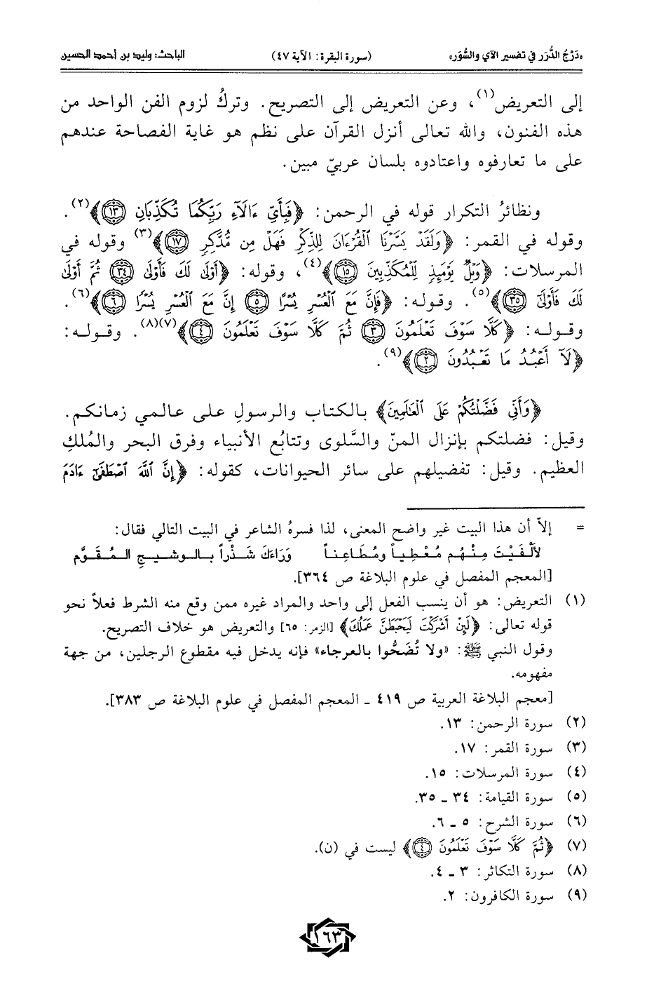 ونظائرُ التكرار قوله في الرحمن: {فَبِأَيِّ آلَاءِ رَبِّكُمَا تُكَذِّبَانِ (13)} (¬2). وقوله في القمر: {وَلَقَدْ يَسَّرْنَا الْقُرْآنَ لِلذِّكْرِ فَهَلْ مِنْ مُدَّكِرٍ (17)} (¬3) وقوله في المرسلات: {وَيْلٌ يَوْمَئِذٍ لِلْمُكَذِّبِينَ (15)} (¬4)، وقوله: {أَوْلَى لَكَ فَأَوْلَى (34) ثُمَّ أَوْلَى لَكَ فَأَوْلَى (35)} (¬5). وقوله: {فَإِنَّ مَعَ الْعُسْرِ يُسْرًا (5) إِنَّ مَعَ الْعُسْرِ يُسْرًا (6)} (¬6). وقوله: {كَلَّا سَوْفَ تَعْلَمُونَ (3) ثُمَّ كَلَّا سَوْفَ تَعْلَمُونَ (4)} (¬7) (¬8). وقوله: {لَا أَعْبُدُ مَا تَعْبُدُونَ (2)} (¬9).