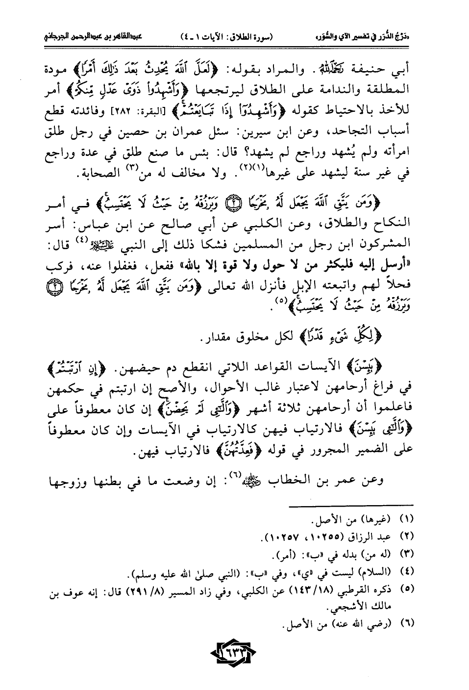 {وَمَنْ يَتَّقِ اللَّهَ يَجْعَلْ لَهُ مَخْرَجًا (2) وَيَرْزُقْهُ مِنْ حَيْثُ لَا يَحْتَسِبُ} في أمر النكاح والطلاق، وعن الكلبي عن أبي صالح عن ابن عباس: أسر المشركون ابن رجل من المسلمين فشكا ذلك إلى النبي -عليه السلام- (¬4) قال: "أرسل إليه فليكثر من لا حول ولا قوة إلا بالله" ففعل، فغفلوا عنه، فركب فحلًا لهم واتبعته الإبل فأنزل الله تعالى {وَمَنْ يَتَّقِ اللَّهَ يَجْعَلْ لَهُ مَخْرَجًا (2) وَيَرْزُقْهُ مِنْ حَيْثُ لَا يَحْتَسِبُ} (¬5).