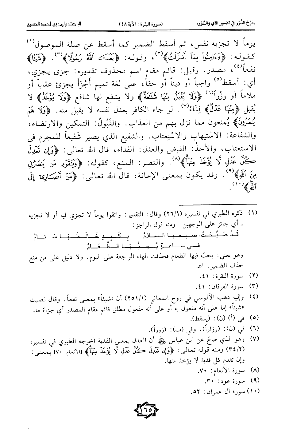 (¬1) ذكره الطبري في تفسيره (1/ 26) وقال: التقدير: واتقوا يومًا لا تجزي فيه أو لا تجزيه