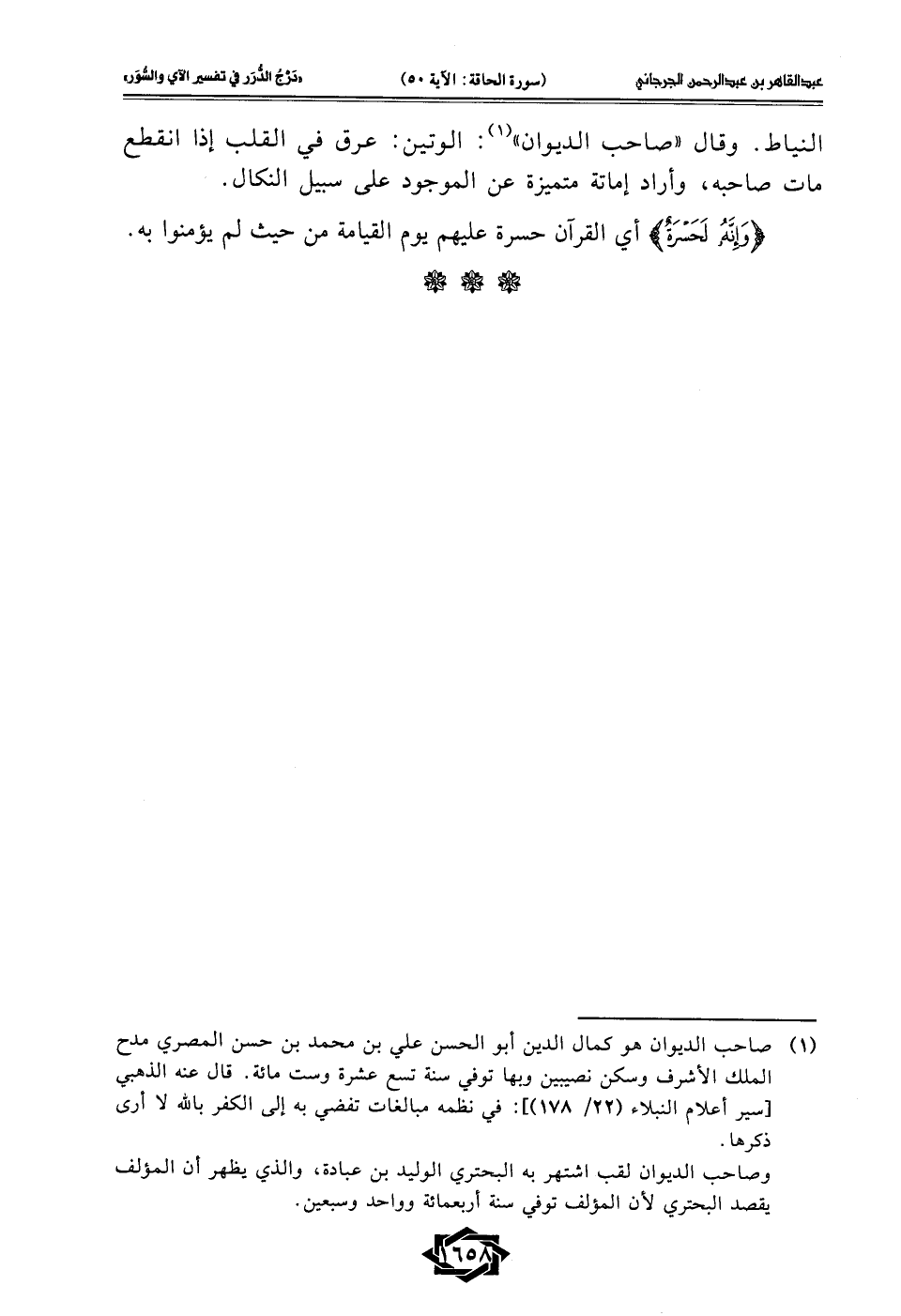 (¬1) صاحب الديوان هو كمال الدين أبو الحسن علي بن محمد بن حسن المصري مدح الملك الأشرف وسكن نصيبين وبها توفي سنة تسع عشرة وست مائة. قال عنه الذهبي [سير أعلام النبلاء (22/ 178)]: في نظمه مبالغات تفضي به إلى الكفر بالله لا أرى ذكر ها.