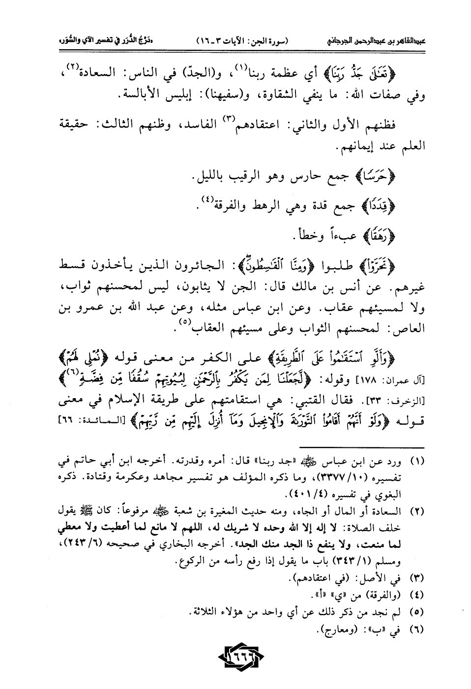 (¬1) ورد عن ابن عباس - رضي الله عنه - "جد ربنا" قال: أمره وقدرته. أخرجه ابن أبي حاتم في تفسيره (10/ 3377)، وما ذكره المؤلف هو تفسير مجاهد وعكرمة وقتادة. ذكره البغوي في تفسيره (4/ 401).