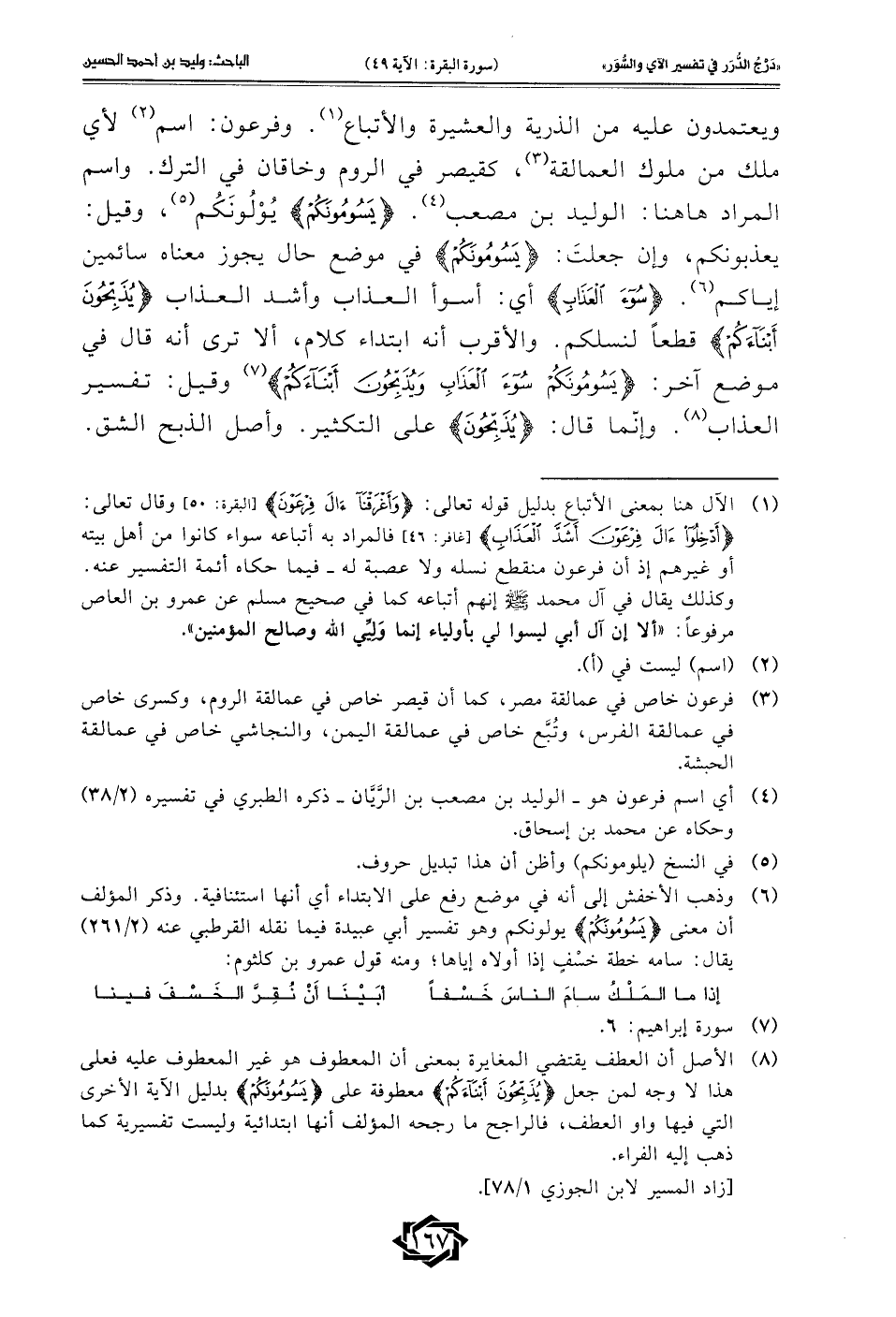 (¬8) الأصل أن العطف يقتضي المغايرة بمعنى أن المعطوف هو غير المعطوف عليه فعلى هذا لا وجه لمن جعل {يُذَبِّحُونَ أَبْنَاءَكُمْ} معطوفة على {يَسُومُونَكُمْ} بدليل الآية الأخرى التي فيها واو العطف، فالراجح ما رجحه المؤلف أنها ابتدائية وليست تفسيرية كما ذهب إليه الفراء.