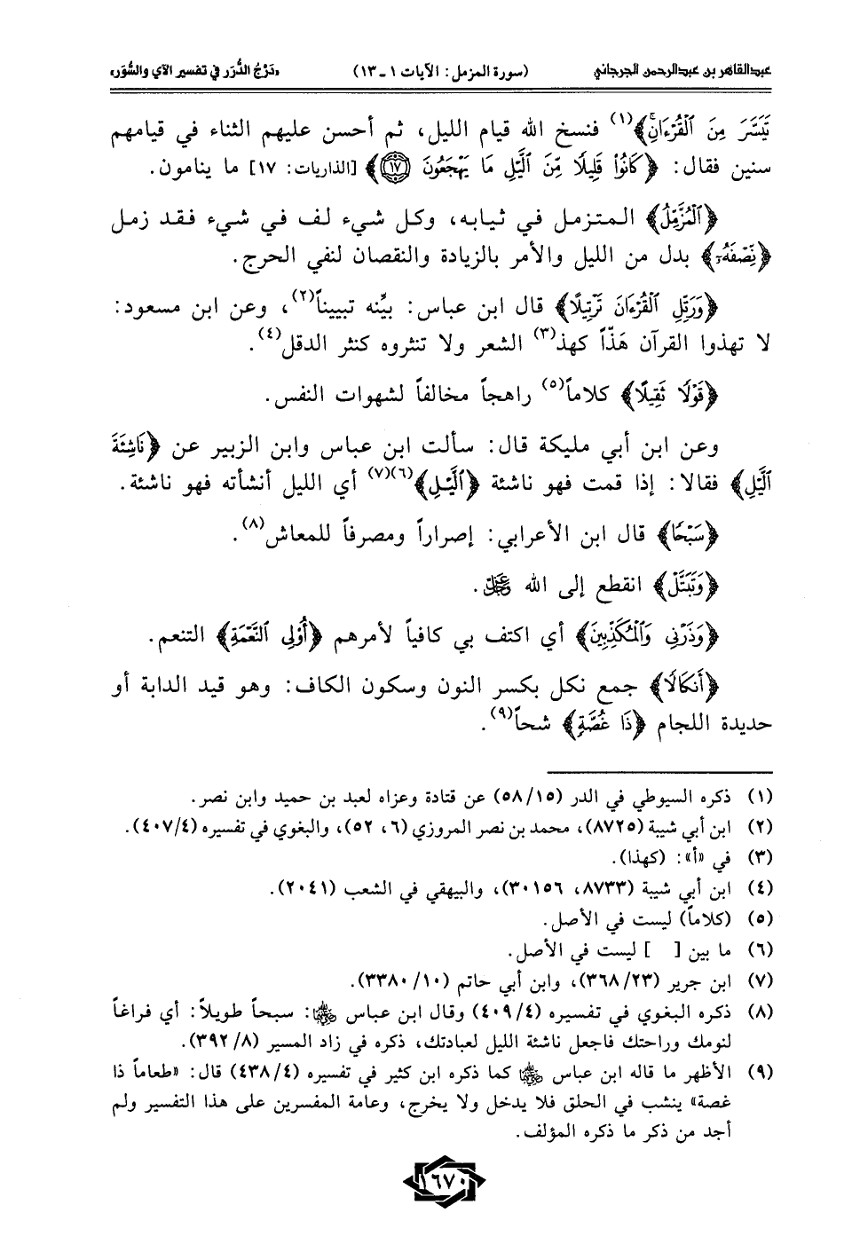 (¬8) ذكره البغوي في تفسيره (4/ 409) وقال ابن عباس - رضي الله عنهما -: سبحًا طويلًا: أي فراغًا لنومك وراحتك فاجعل ناشئة الليل لعبادتك، ذكره في زاد المسير (8/ 392).