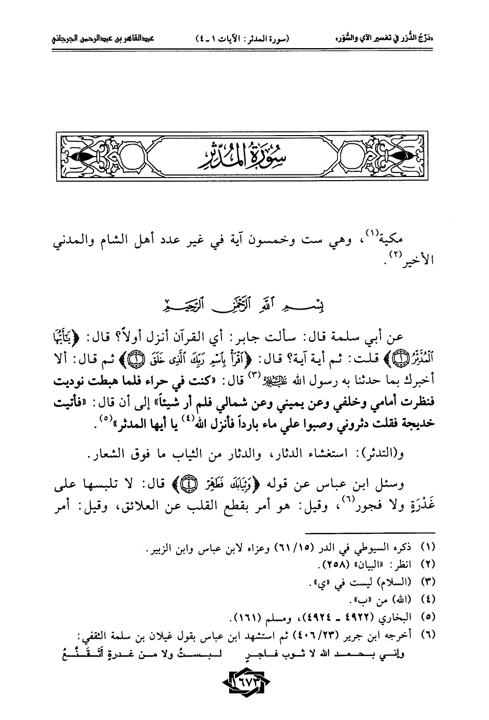 عن أبي سلمة قال: سألت جابر: أي القرآن أنزل أولًا؟ قال: {يَا أَيُّهَا الْمُدَّثِّرُ (1)} قلت: ثم أية آية؟ قال: {اقْرَأْ بِاسْمِ رَبِّكَ الَّذِي خَلَقَ (1)} ثم قال: ألا أخبرك بما حدثنا به رسول الله -عليه السلام- (¬3) قال: "كنت في حراء فلما هبطت نوديت فنظرت أمامي وخلفي وعن يميني وعن شمالي فلم أر شيئًا" إلى أن قال: "فأتيت خديجة فقلت دثروني وصبوا علي ماء باردًا فأنزل الله (¬4) يا أيها المدثر" (¬5).