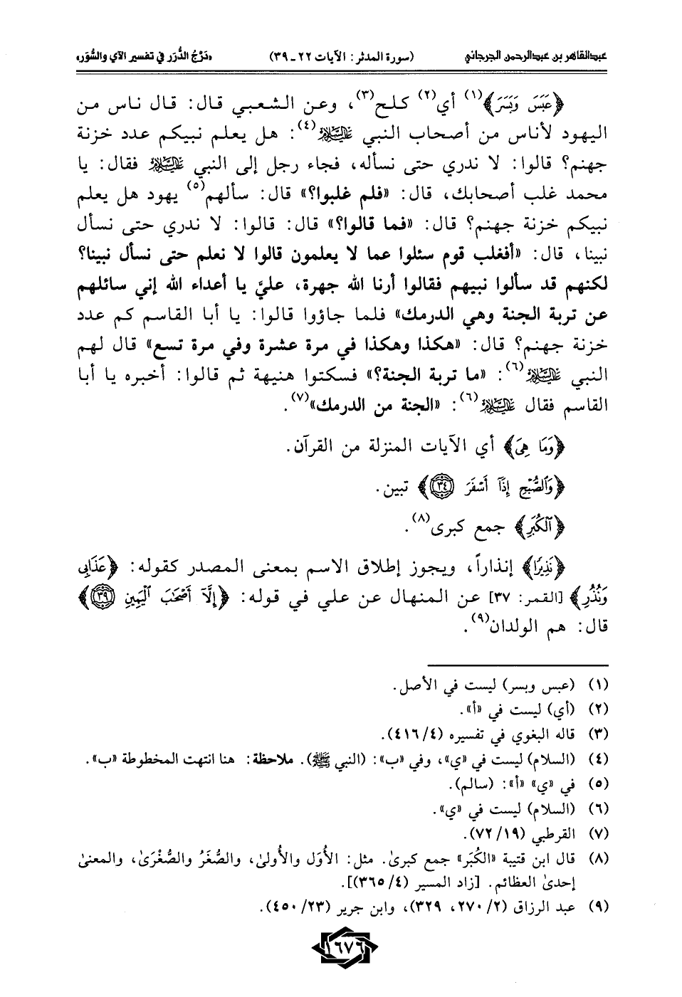 {عَبَسَ وَبَسَرَ} (¬1) أي (¬2) كلح (¬3)، وعن الشعبي قال: قال ناس من اليهود لأناس من أصحاب النبي -عليه السلام- (¬4): هل يعلم نبيكم عدد خزنة جهنم؟ قالوا: لا ندري حتى نسأله, فجاء رجل إلى النبي -عليه السلام- فقال: يا محمَّد غلب أصحابك، قال: "فلم غلبوا؟ " قال: سألهم (¬5) يهود هل يعلم نبيكم خزنة جهنم؟ قال: "فما قالوا؟ " قال: قالوا: لا ندري حتى نسأل نبينا، قال: "أفغلب قوم سئلوا عما لا يعلمون قالوا لا نعلم حتى نسأل نبينا؟ لكنهم قد سألوا نبيهم فقالوا أرنا الله جهرة، عليَّ يا أعداء الله إني سائلهم عن تربة الجنة وهي الدرمك" فلما جاؤوا قالوا: يا أبا القاسم كم عدد خزنة جهنم؟ قال: "هكذا وهكذا في مرة عشرة وفي مرة تسع" قال لهم النبي -عليه السلام- (¬6): "ما تربة الجنة؟ " فسكتوا هنيهة ثم قالوا: أخبره يا أبا القاسم فقال -عليه السلام- (6): "الجنة من الدرمك" (¬7).
