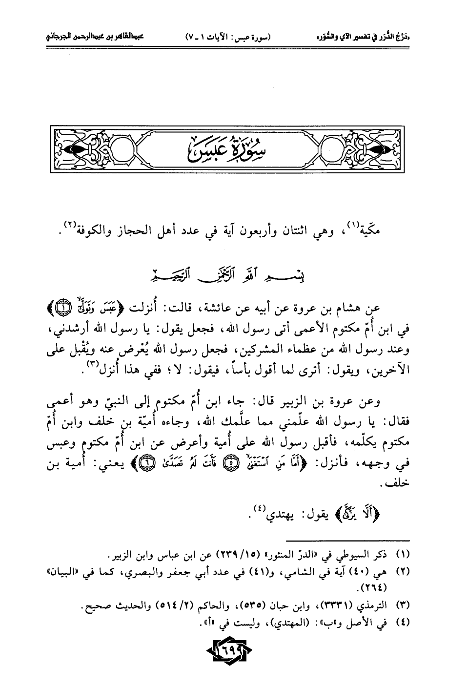 عن هشام بن عروة عن أبيه عن عائشة، قالت: أُنزلت {عَبَسَ وَتَوَلَّى (1)} في ابن أُمّ مكتوم الأعمى أتى رسول الله، فجعل يقول: يا رسول الله أرشدني، وعند رسول الله من عظماء المشركين، فجعل رسول الله يُعْرض عنه ويُقْبل على الآخرين، ويقول: أترى لما أقول بأسًا، فيقول: لا؛ ففي هذا أُنزل (¬3).