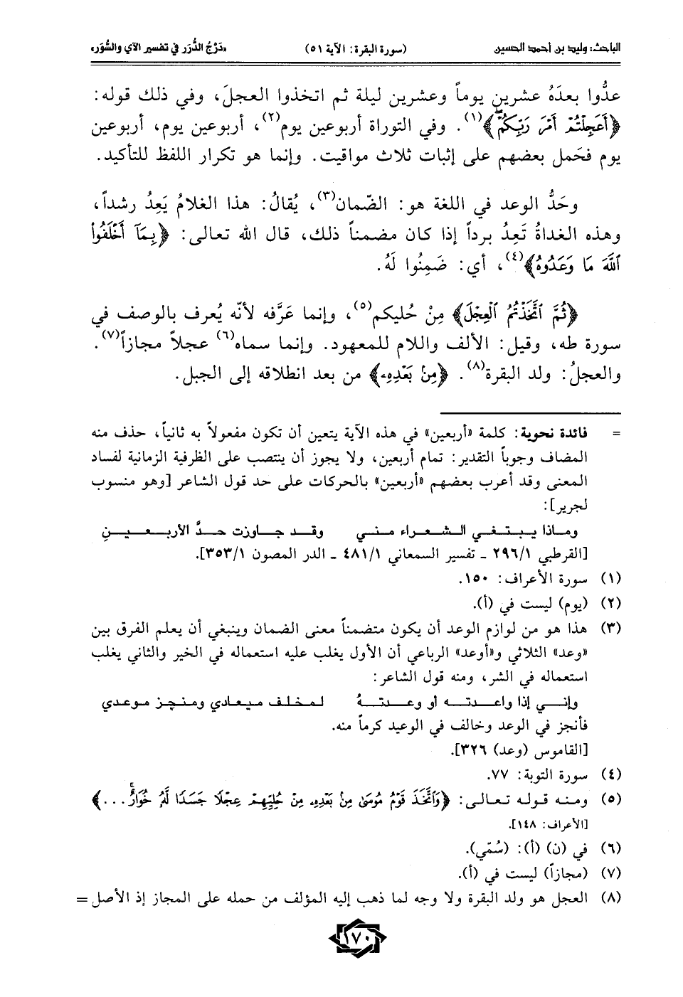 = فائدة نحوية: كلمة "أربعين" في هذه الآية يتعين أن تكون مفعولًا به ثانيًا، حذف منه المضاف وجوبًا التقدير: تمام أربعين، ولا يجوز أن ينتصب على الظرفية الزمانية لفساد المعنى وقد أعرب بعضهم "أربعين" بالحركات على حد قول الشاعر [وهو منسوب لجرير]: