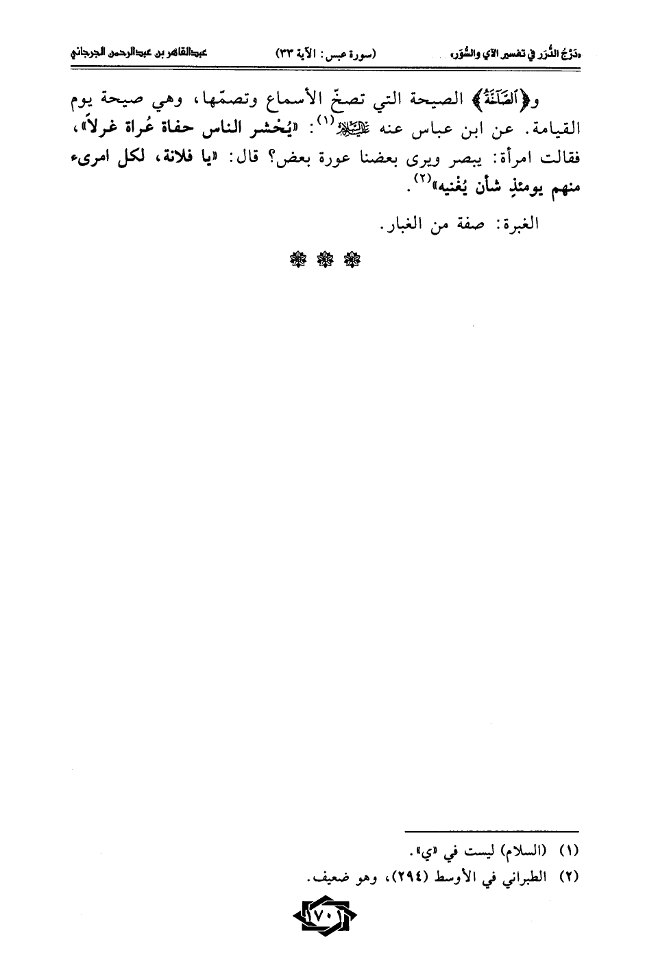 و {الصَّاخَّةُ} الصيحة التي تصخّ الأسماع وتصمّها، وهي صيحة يوم القيامة. عن ابن عباس عنه -عليه السلام- (¬1): "يُحْشر الناس حفاة عُراة غرلًا"، فقالت امرأة: يبصر ويرى بعضنا عورة بعض؟ قال: "يا فلانة، لكل امرئ منهم يومئذِ شأن يُغْنيه" (¬2).