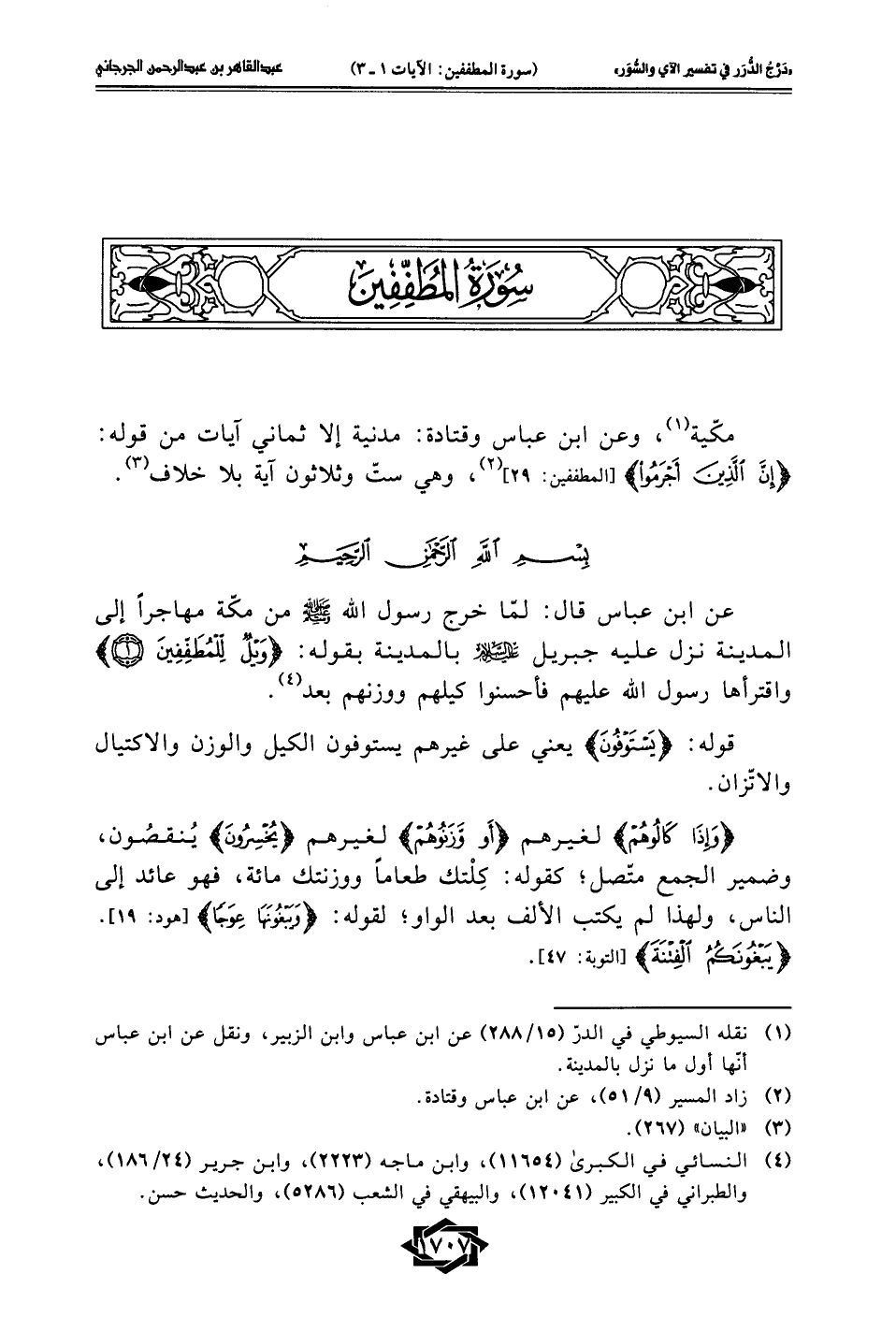 عن ابن عباس قال: لمّا خرج رسول الله - صلى الله عليه وسلم - من مكّة مهاجرًا إلى المدينة نزل عليه جبريل -عليه السلام- بالمدينة بقوله: {وَيْلٌ لِلْمُطَفِّفِينَ (1)} واقترأها رسول الله عليهم فأحسنوا كيلهم ووزنهم بعد (¬4).