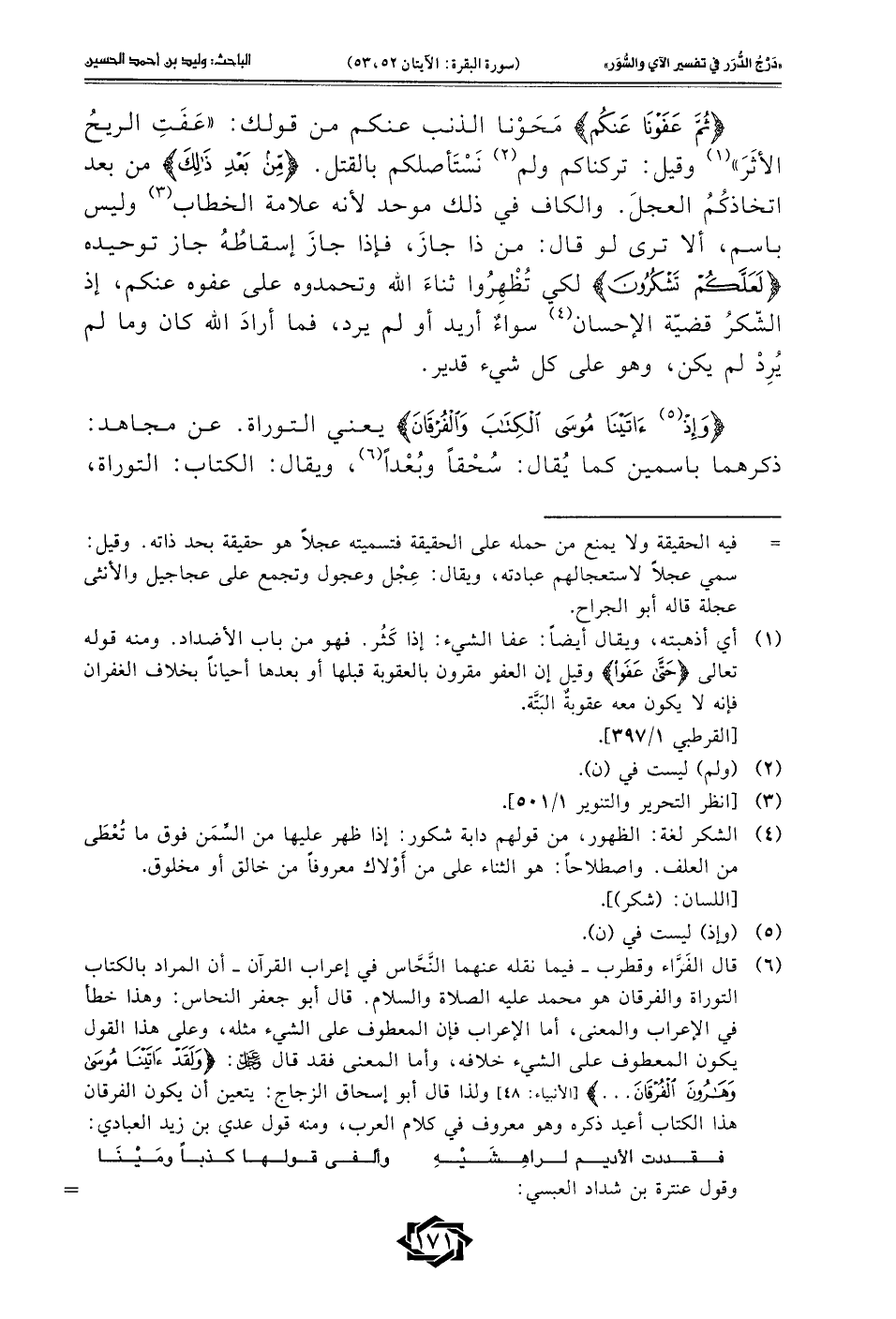 {ثُمَّ عَفَوْنَا عَنْكُمْ} مَحَوْنا الذنب عنكم من قولك: "عَفَتِ الريحُ الأثَرَ" (¬1) وقيل: تركناكم ولم (¬2) نَسْتَأصلكم بالقتل. {مِنْ بَعْدِ ذَلِكَ} من بعد اتخاذكُمُ العجلَ. والكاف في ذلك موحد لأنه علامة الخطاب (¬3) وليس باسم، ألا ترى لو قال: من ذا جازَ، فإذا جازَ إسقاطُهُ جاز توحيده {لَعَلَّكُمْ تَشْكُرُونَ} لكي تُظْهِرُوا ثناءَ الله وتحمدوه على عفوه عنكم، إذ الشّكرُ قضيّة الإحسان (¬4) سواءٌ أريد أو لم يرد، فما أرادَ الله كان وما لم يُرِدْ لم يكن، وهو على كل شيء قدير.