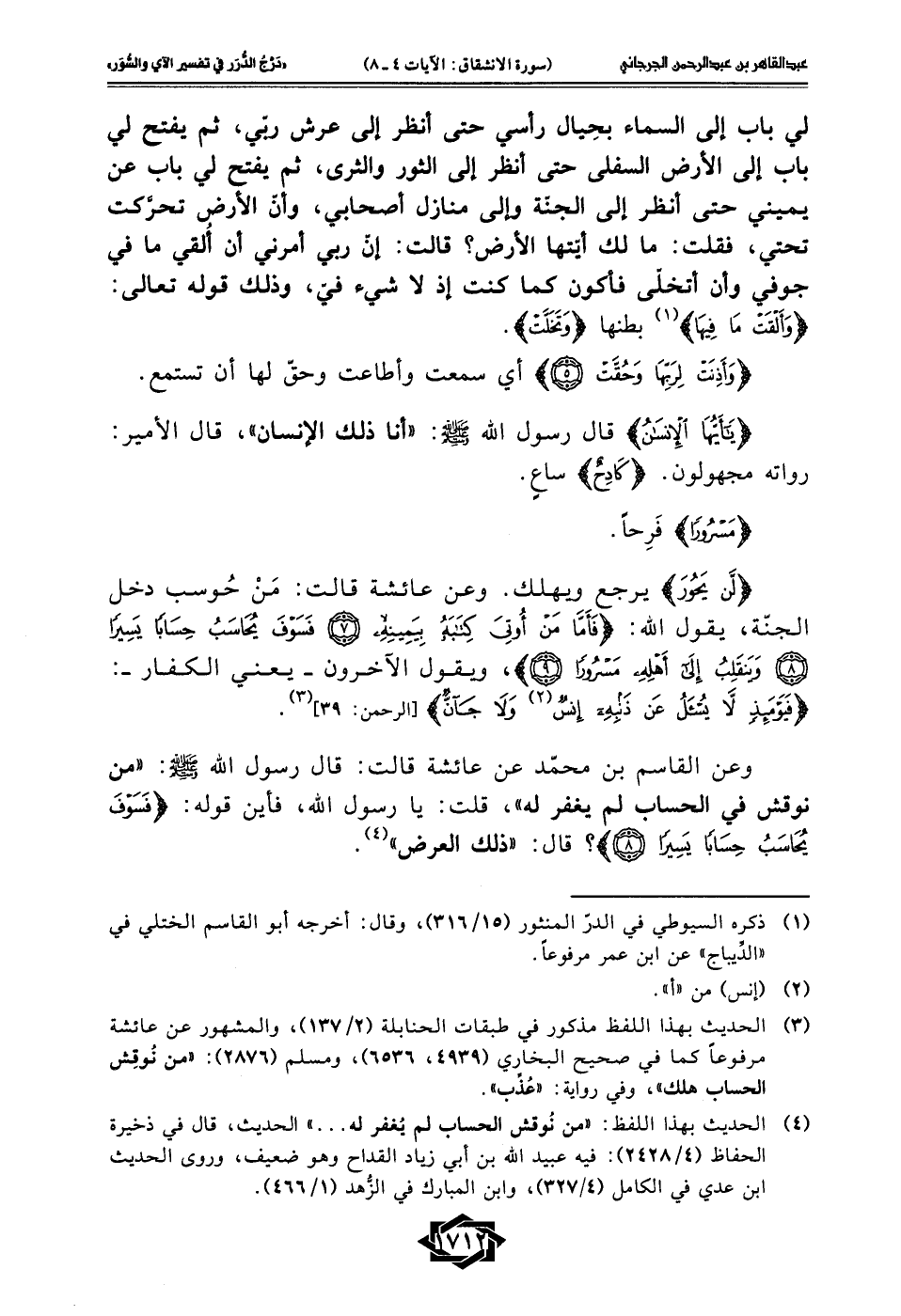 (¬4) الحديث بهذا اللفظ: "من نُوقش الحساب لم يُغفر له ... " الحديث، قال في ذخيرة الحفاظ (4/ 2428): فيه عبيد الله بن أبي زياد القداح وهو ضعيف، وروى الحديث ابن عدي في الكامل (4/ 327)، وابن المبارك في الزُّهد (1/ 466).