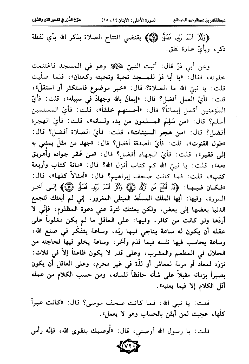 وعن أبي ذرّ قال: أتيت النبيّ -عليه السلام- وهو في المسجد فاغتنمت خلوته، فقال: "يا أبا ذرّ للمسجد تحية وتحيته ركعتان"، فلما صلّيت قلت: يا نبيّ الله ما الصلاة؟ قال: "خير موضوع فاستكثر أو استقلّ"، قلت: فأيّ العمل أفضل؟ قال: "إيمانٌ بالله وجهادٌ في سبيله"، قلت: فأيّ المؤمنين أكمل إيمانًا؟ قال: "أحسنهم خلقًا"، قلت: فأيّ المسلمين أسلم؟ قال: "من سَلِمَ المسلمون من يده ولسانه"، قلت: فأيّ الهجرة أفضل؟ قال: "من هجر السيئات"، قلت: فأيّ الصلاة أفضل؟ قال: "طول القنوت"، قلت: فأيّ الصدقة أفضل؟ قال: "جهد من مقلّ يمشي به إلى فقير"، قلت: فأيّ الجهاد أفضل؟ قال: "من عُقر جواده وأُهريق دمه"، قلت: يا نبيّ الله كم كتاب أنزل الله؟ قال: "مائة كتاب وأربعة كتب"، قلت: فما كانت صحف إبراهيم؟ قال: "أمثالًا كلها"، قال: "فكان فيها: {قَدْ أَفْلَحَ مَنْ تَزَكَّى (14) وَذَكَرَ اسْمَ رَبِّهِ فَصَلَّى (15)} إلى آخر السورة، وفيها: أيّها الملك المسلّط المبتلى المغرور، إني لم أبعثك لتجمع الدنيا بعضها إلى بعض، ولكن بعثتك لتردّ عني دعوة المظلوم، فإنّي لا أردّها ولو كانت من كافر، وفيها: على العاقل ما لم يكن مغلوبًا على عقله أن يكون له ساعة يناجي فيها ربّه، وساعة يتفكّر في صنع الله، وساعة يحاسب فيها نفسه فيما قدّم وأخّر، وساعة يخلو فيها لحاجته من الحلال في المطعم والمشرب، وعلى قدر لا يكون ظاعنًا إلَّا في ثلاث: تزوّد لمعاد أو مرمة لمعاش أو لذّة في غير محرم، وعلى العاقل أن يكون بصيرًا بزمانه مقبلًا على شأنه حافظًا للسانه، ومن حسب الكلام من عمله أقل الكلام إلا فيما يعنيه".