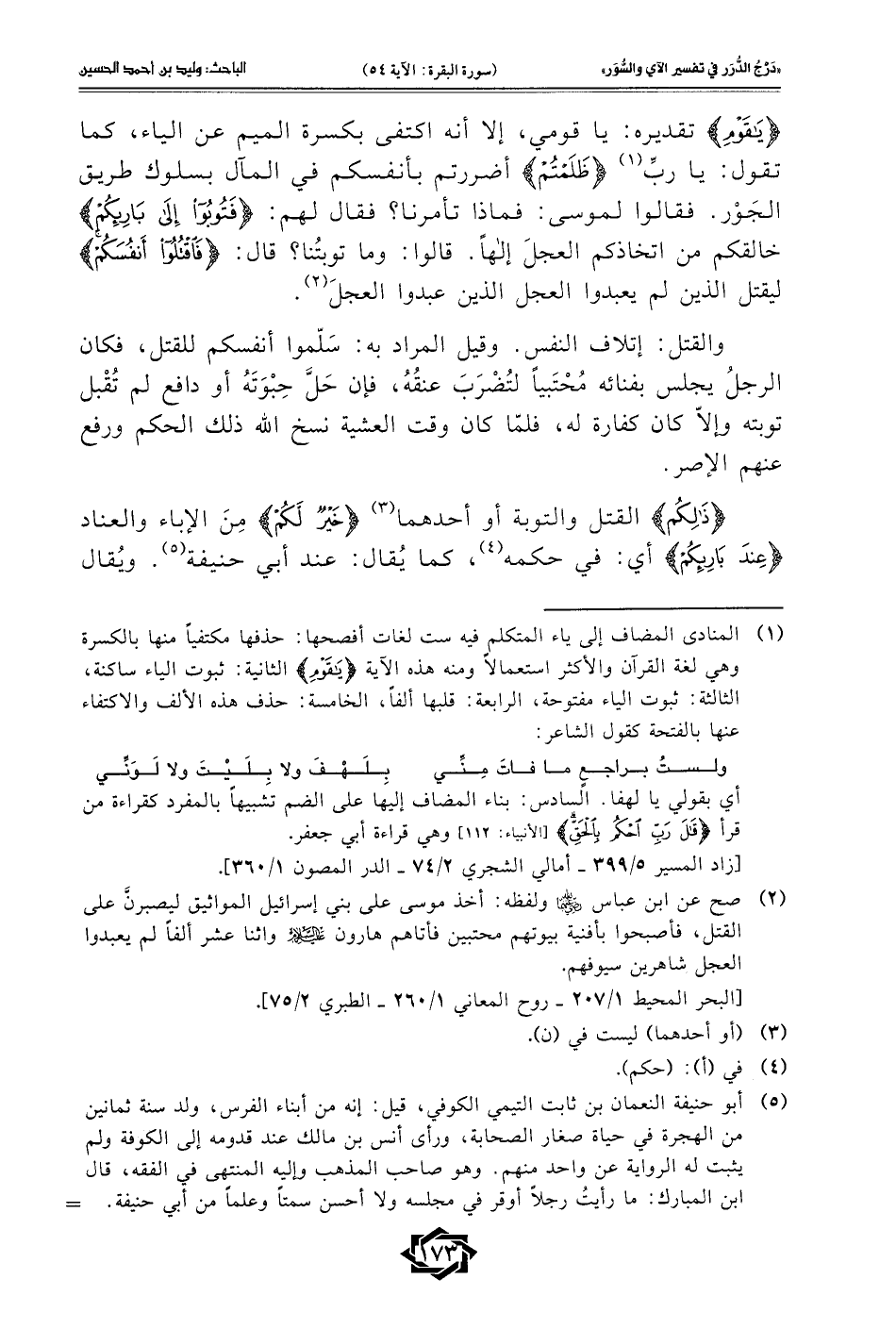 {يَا قَوْمِ} تقديره: يا قومي، إلا أنه اكتفى بكسرة الميم عن الياء، كما تقول: يا ربِّ (¬1) {ظَلَمْتُمْ} أضررتم بأنفسكم في المآل بسلوك طريق الجَوْر. فقالوا لموسى: فماذا تأمرنا؟ فقال لهم: {فَتُوبُوا إِلَى بَارِئِكُمْ} خالقكم من اتخاذكم العجلَ إلهًا. قالوا: وما توبتُنا؟ قال: {فَاقْتُلُوا أَنْفُسَكُمْ} ليقتل الذين لم يعبدوا العجل الذين عبدوا العجلَ (¬2).