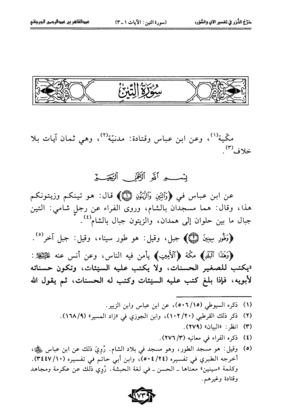عن ابن عباس في {وَالتِّينِ وَالزَّيْتُونِ (1)} قال: هو تينكم وزيتونكم هذا، وقال: هما مسجدان بالشام، وروى الفراء عن رجلٍ شامي: التين جبال ما بين حلوان إلى همدان، والزيتون جبال بالشام (¬4).
