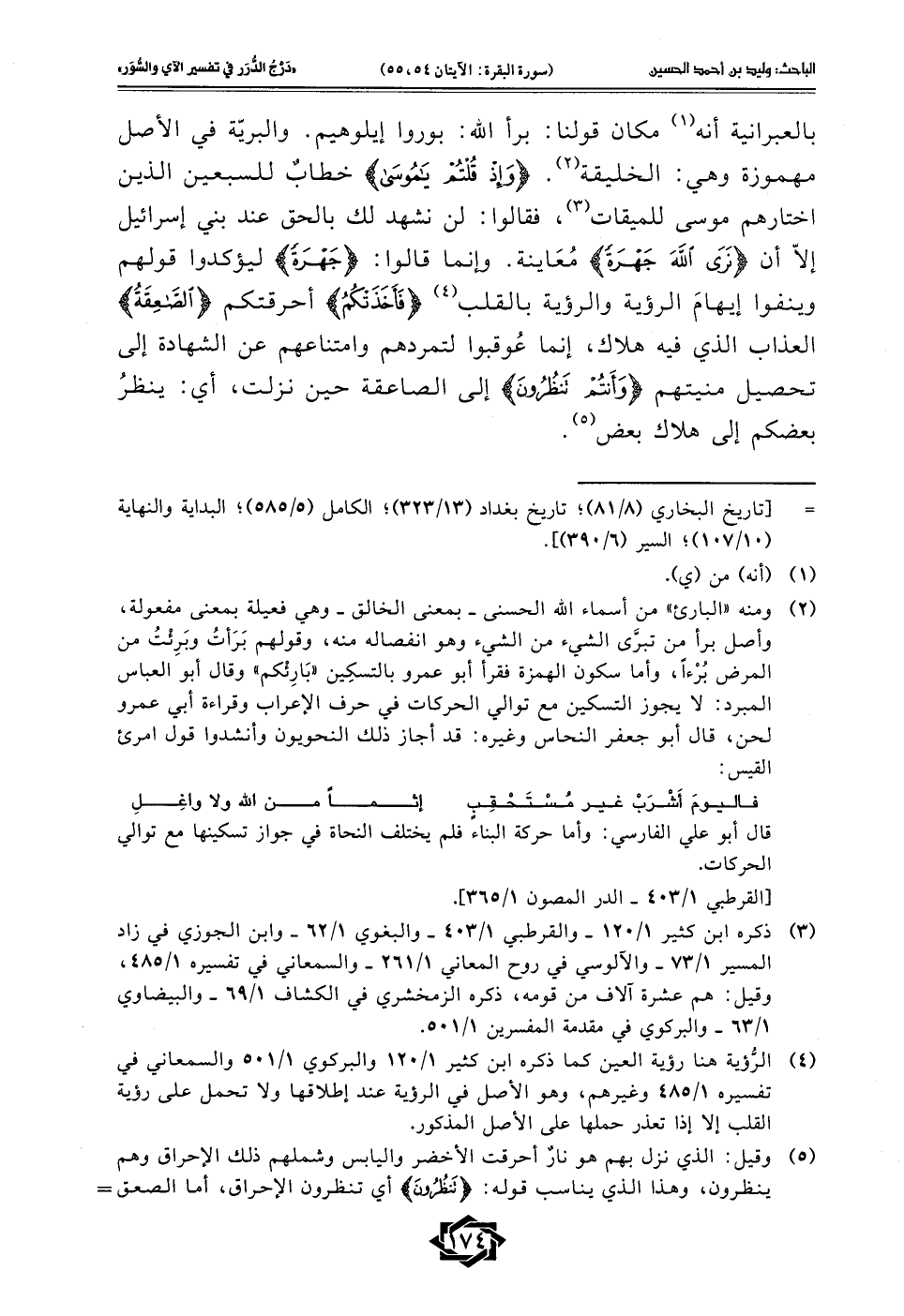 (¬4) الرُّؤية هنا رؤية العين كما ذكره ابن كثير 1/ 120 والبركوي 1/ 501 والسمعاني في تفسيره1/ 485 وغيرهم، وهو الأصل في الرؤية عند إطلاقها ولا تحمل على رؤية القلب إلا إذا تعذر حملها على الأصل المذكور.
