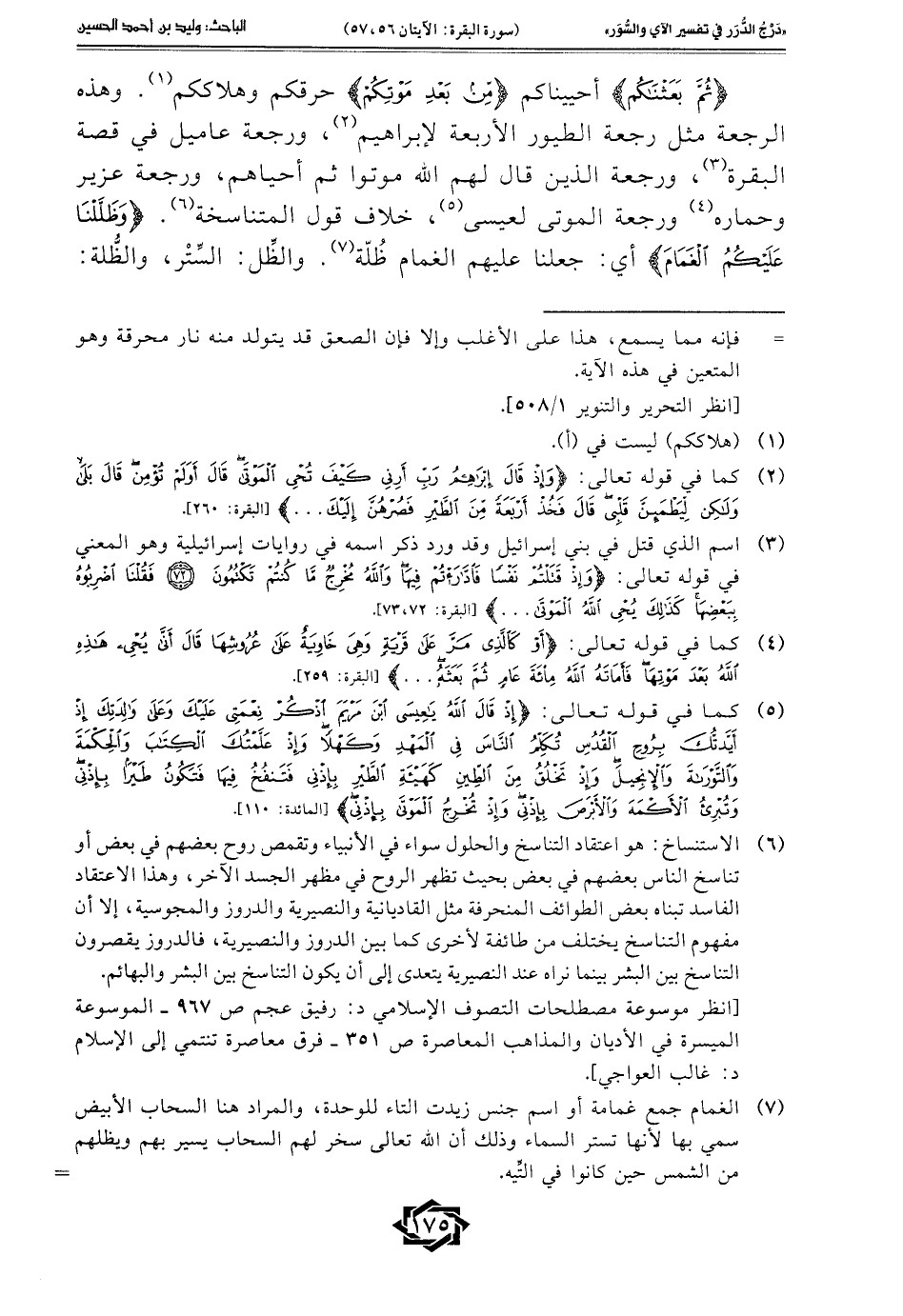 {ثُمَّ بَعَثْنَاكُمْ} أحييناكم {مِنْ بَعْدِ مَوْتِكُمْ} حرقكم وهلاككم (¬1). وهذه الرجعة مثل رجعة الطيور الأربعة لإبراهيم (¬2)، ورجعة عاميل في قصة البقرة (¬3)، ورجعة الذين قال لهم الله موتوا ثم أحياهم، ورجعة عزير وحماره (¬4) ورجعة الموتى لعيسى (¬5)، خلاف قول المتناسخة (¬6). {وَظَلَّلْنَا عَلَيْكُمُ الْغَمَامَ} أي: جعلنا عليهم الغمام ظُلّة (¬7). والظِّل: السِّتْر، والظُّلة: