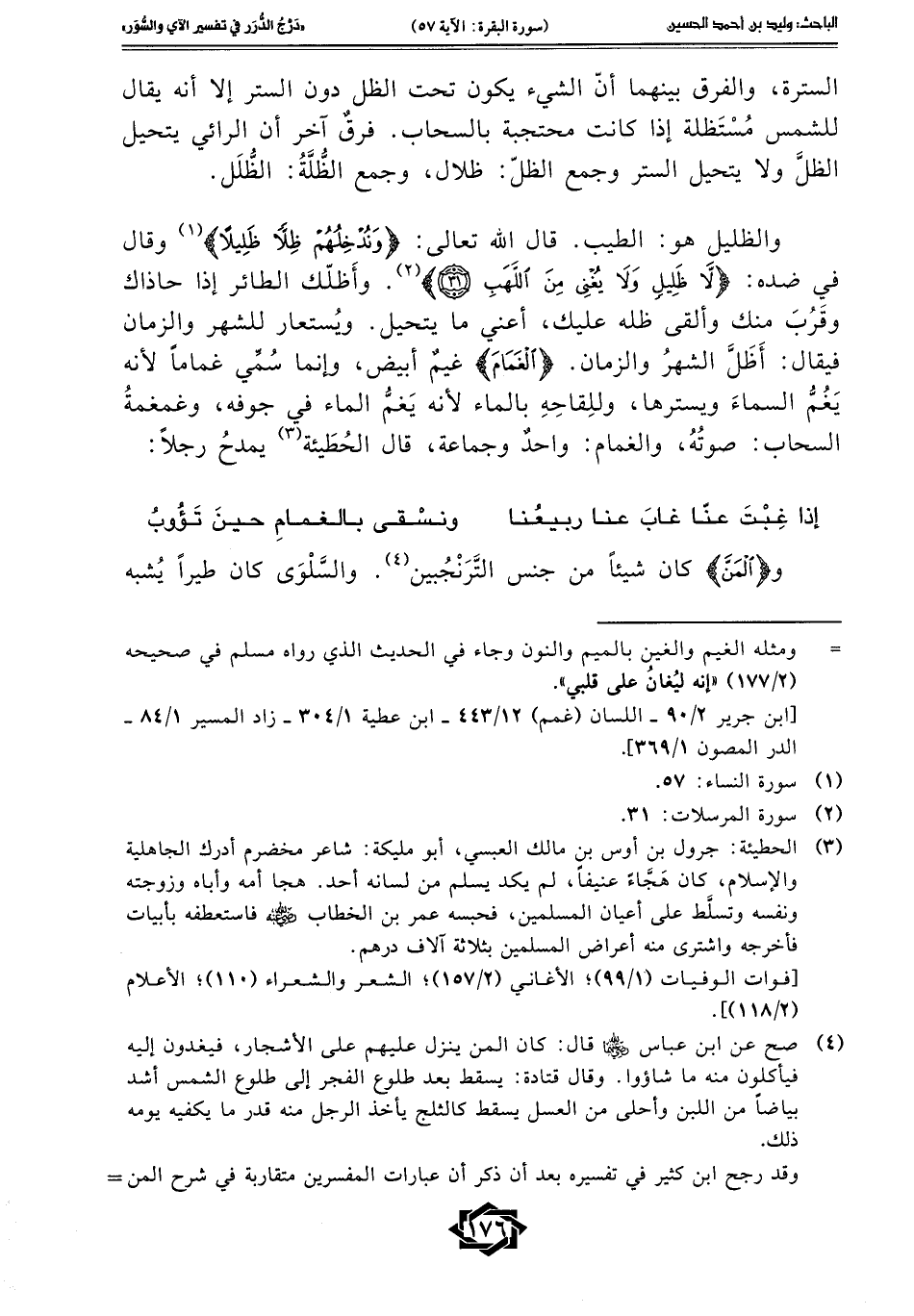 (¬4) صح عن ابن عباس - رضي الله عنهما - قال: كان المن ينزل عليهم على الأشجار، فيغدون إليه فيأكلون منه ما شاؤوا. وقال قتادة: يسقط بعد طلوع الفجر إلى طلوع الشمس أشد بياضًا من اللبن وأحلى من العسل يسقط كالثلج يأخذ الرجل منه قدر ما يكفيه يومه ذلك.