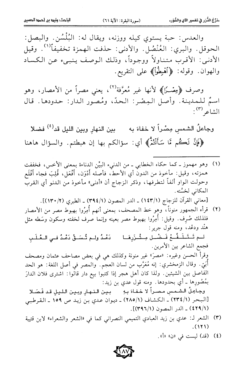 (¬2) قرأه الجمهور منونًا، وهو خط المصحف، بمعنى أنهم أُمِرُوا بهبوط مصر من الأمصار فلذلك صُرِف. وقيل: أُمِرُوا بهبوط مصر بعينه وإنما صرف لخفته وسكون وسَطه مثل هنْد ودعْد، ومنه قول جرير: