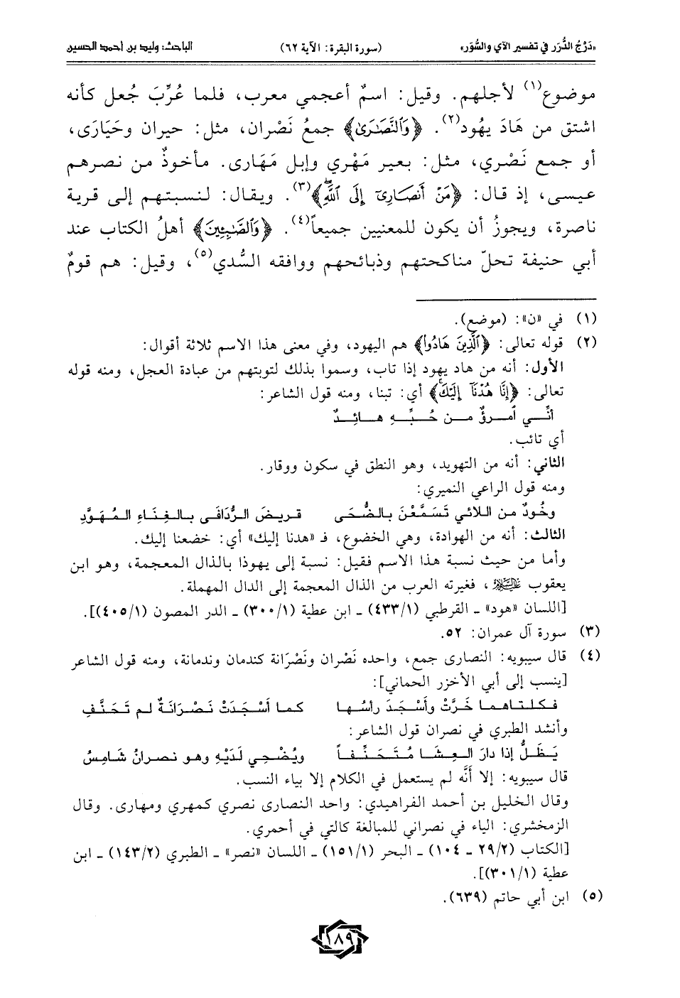 موضوع (¬1) لأجلهم. وقيل: اسمٌ اعجمي معرب، فلما عُرَّبَ جُعل كأنه اشتق من هَادَ يهُود (¬2). {وَالنَّصَارَى} جمعُ نَصْران، مثل: حيران وحَيَارَى، أو جمع نَصْري، مثل: بعير مَهْري وإبل مَهَارى. مأخوذٌ من نصرهم عيسى، إذ قال: {مَنْ أَنْصَارِي إِلَى اللَّهِ} (¬3). ويقال: لنسبتهم إلى قرية ناصرة، ويجوزُ أن يكون للمعنيين جميعًا (¬4). {وَالصَّابِئِينَ} أهلُ الكتاب عند أبي حنيفة تحلّ مناكحتهم وذبائحهم ووافقه السُّدي (¬5)، وقيل: هم قومٌ