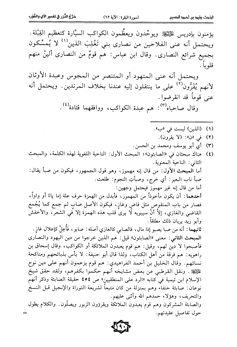 (¬4) هناك مبحثان في "الصابئون"؛ المبحث الأول: الناحية اللغوية لهذه الكلمة، والمبحث الثاني: الناحية المعنوية.