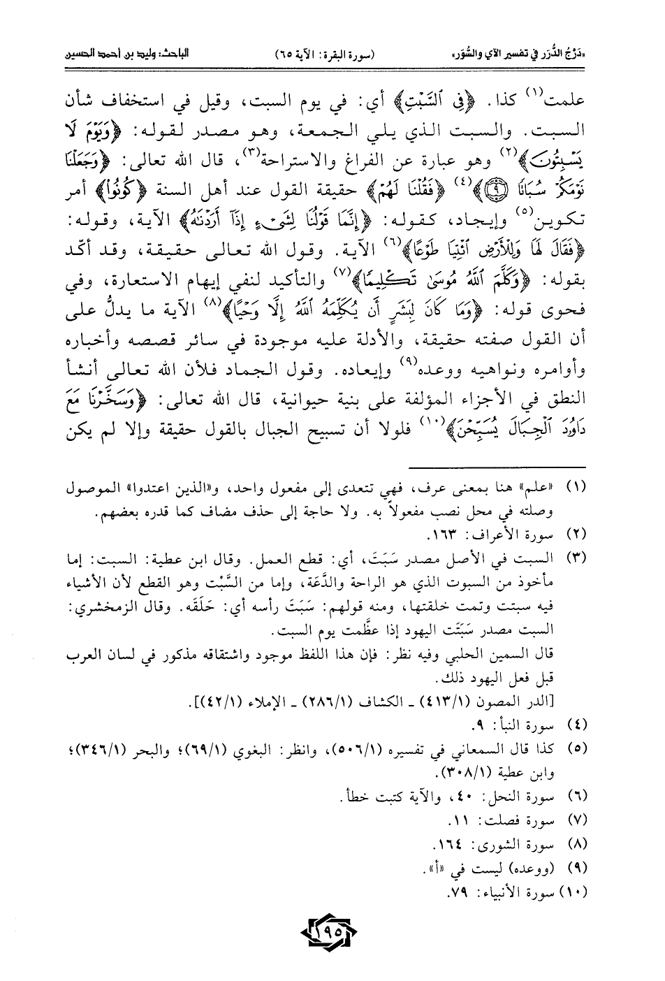 (¬3) السبت في الأصل مصدر سبَتَ، أي: قطع العمل. وقال ابن عطية: السبت: إما مأخوذ من السبوت الذي هو الراحة والدَّعَة، وإما من السَّبْت وهو القطع لأن الأشياء فيه سبتت وتمت خلقتها، ومنه قولهم: سَبَتَ رأسه أي: حَلَقَه. وقال الزمخشري: السبت مصدر سَبَتَت اليهود إذا عظَّمت يوم السبت. قال السمين الحلبي وفيه نظر: فإن هذا اللفظ موجود واشتقاقه مذكور في لسان العرب قبل فعل اليهود ذلك.